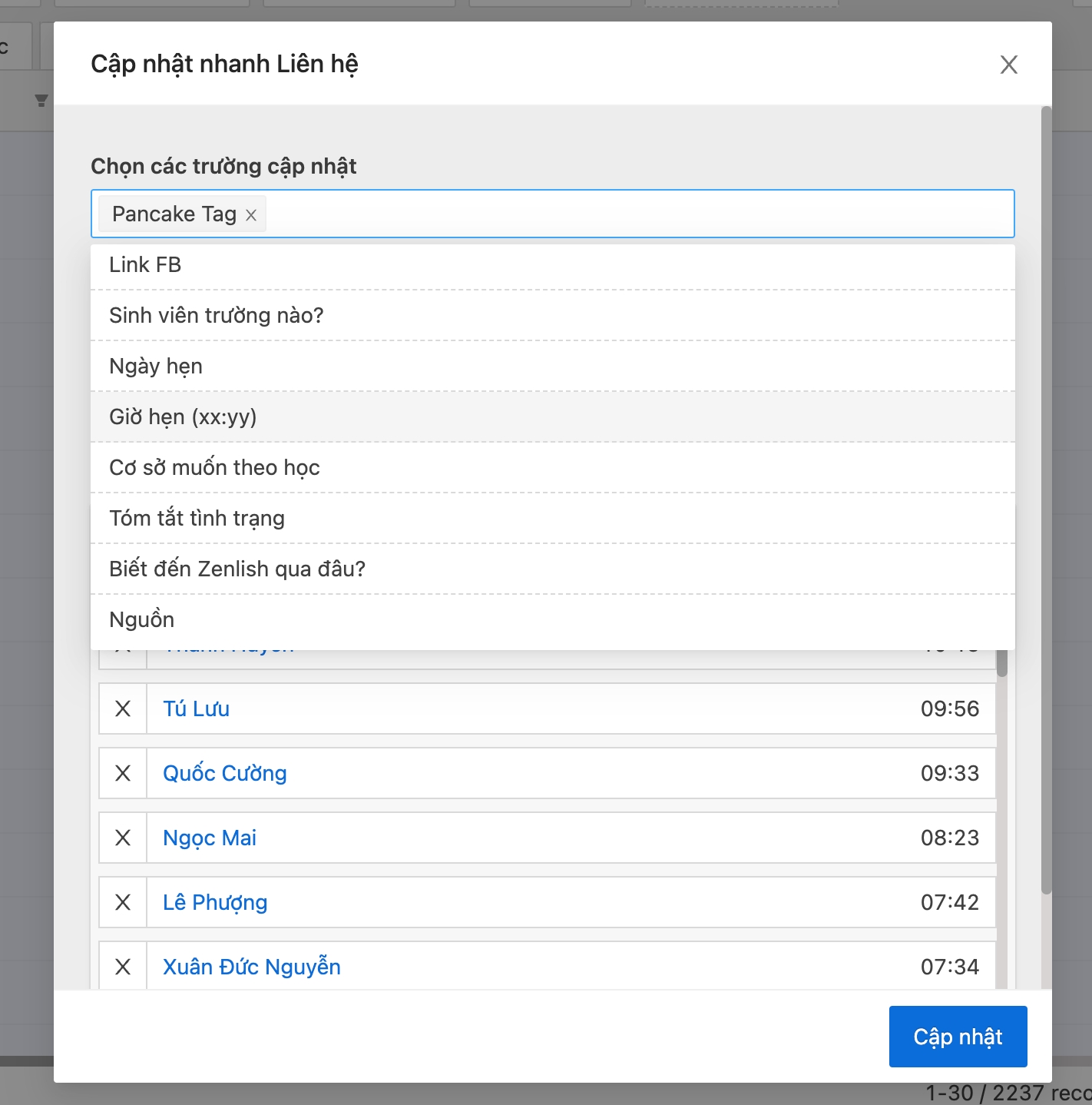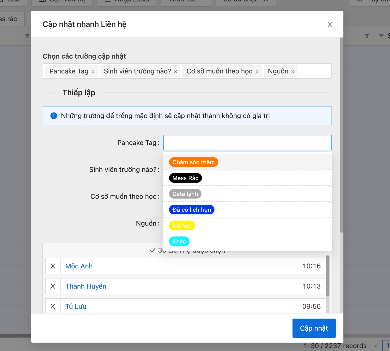 Bước 3: Chọn trường cần cập nhật, có thể chọn nhiều trường và cập nhật cùng một lúc