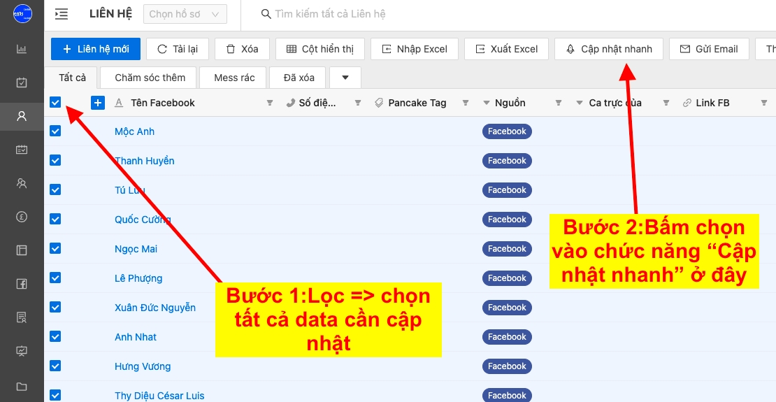 Quick update: This function helps us update information in fields for many customers and many data at the same time.