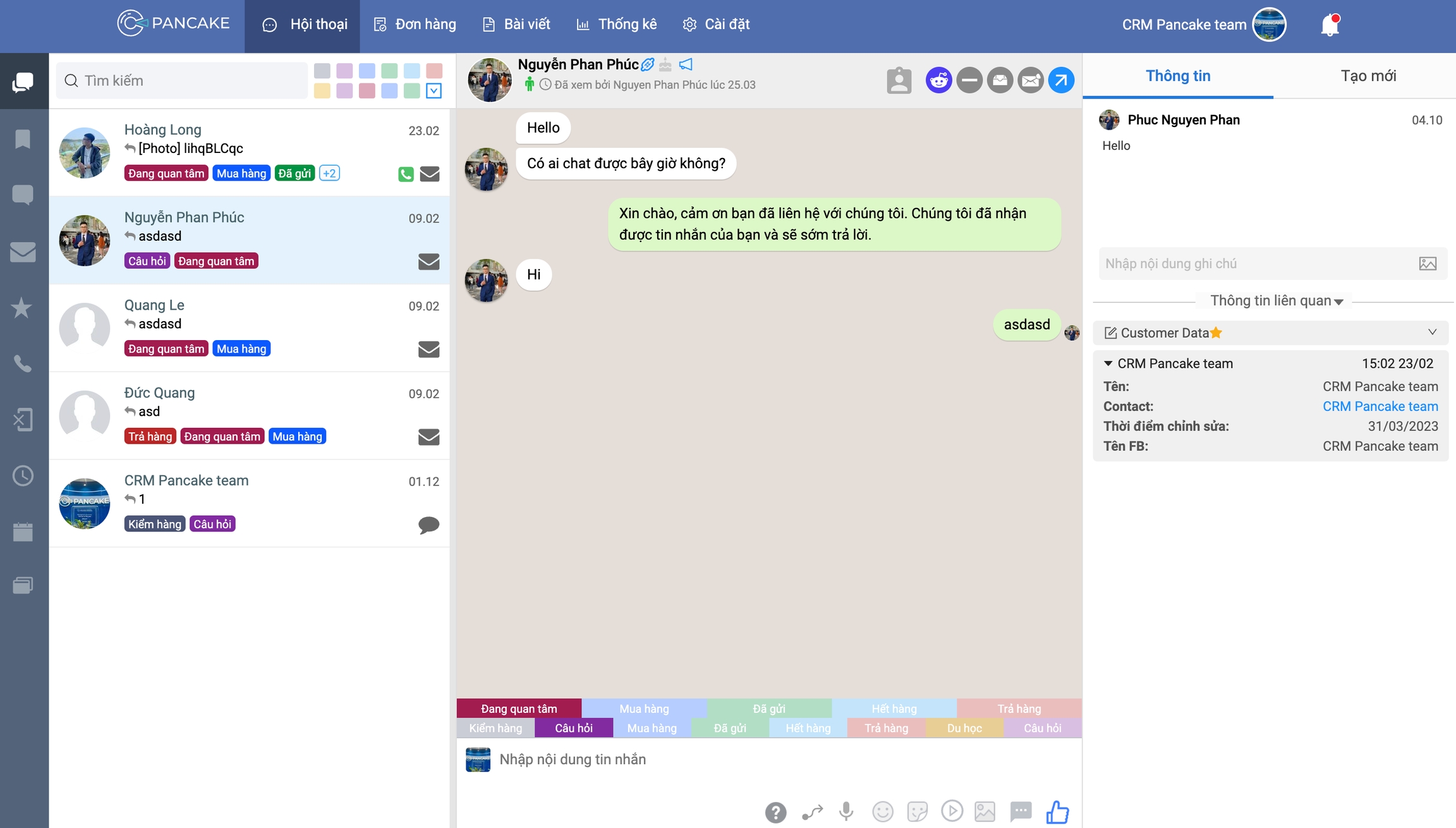With the aim of helping you to reply to comments and messages as quickly as possible, Pancake automatically aggregates all exchanges into a single interface, as well as providing basic function buttons right below the exchange content such as like, hide, delete, view comments directly on Facebook, respond privately by message from comments to guests (only works for Fan Pages that have been updated by Facebook with the function of sending messages to guests before).