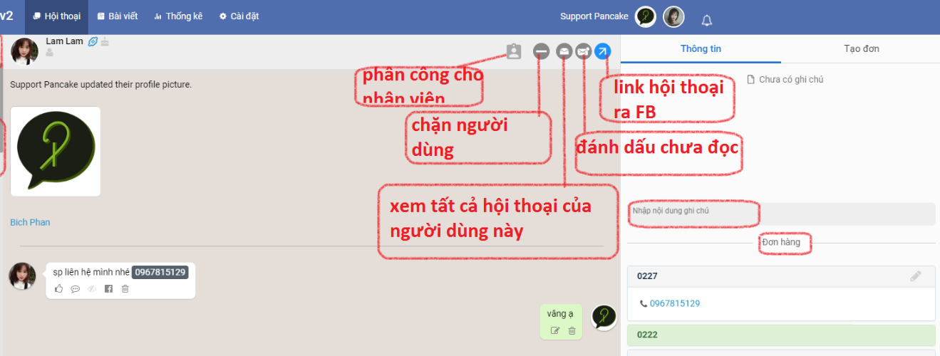 - Comment information is still saved in pages.fm even if the comment or the entire post is deleted on Facebook. 2- To avoid missing any exchanges in Fan Page, you should activate the "show unread conversations at the top" mode in the general settings of pages.fm 3- When using pages.fm, if you see that the image is not displayed or cannot insert the image into the comment, there are 2 main reasons: you are not logged in to Facebook, or the host file used to access your Facebook is not compatible. You can fix this by logging in to Facebook in another tab of the browser or turning on the error correction mode for images not displayed in the settings section. 4- You can manage multiple Fanpages by opening multiple tabs on the same browser or using the merge pages mode to manage them in one interface 5- When encountering spammers, troublemakers or bad behavior that affects the Fan Page, you can block the Facebook ID right on the chat interface by clicking on the block button on the right side of the chat box, under the customer's name. 6- If you want to review the conversation with the customer on Facebook, click on the arrow at the top of the chat box. If you want to know information about the customer's personal page, just click on the customer's avatar and a new window will appear next to that customer's Facebook.