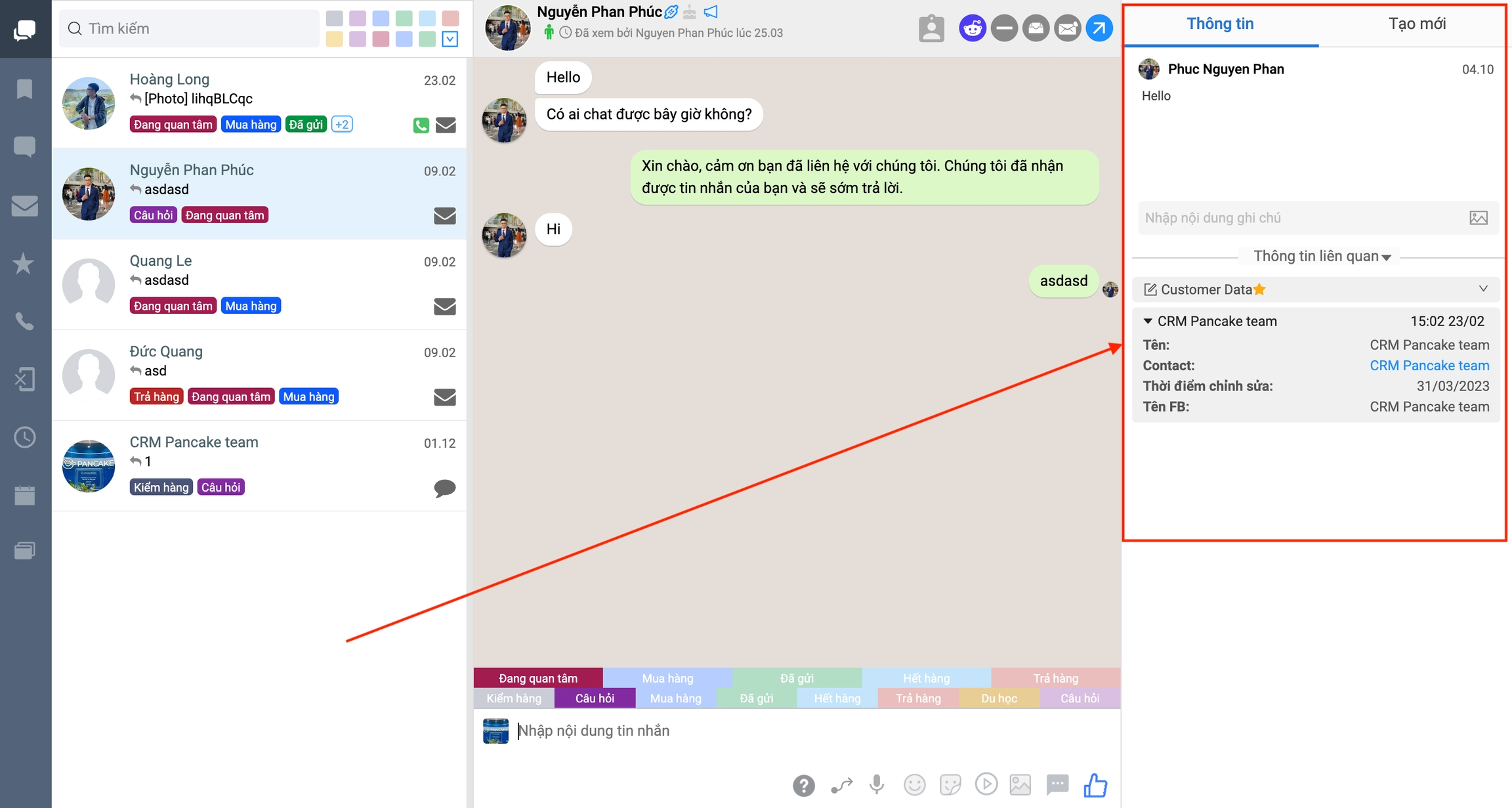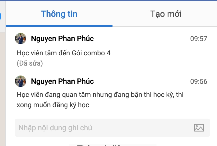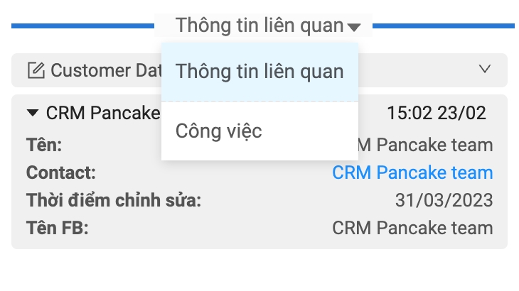"Customer Data" tab: When the student agrees to receive consultation and selects a time, you switch from the "Contact" tab to "Customer Data" and fill in the information completely, similar to filling out the form when the student agrees to receive consultation. You will only need to work right on the Pancake interface.