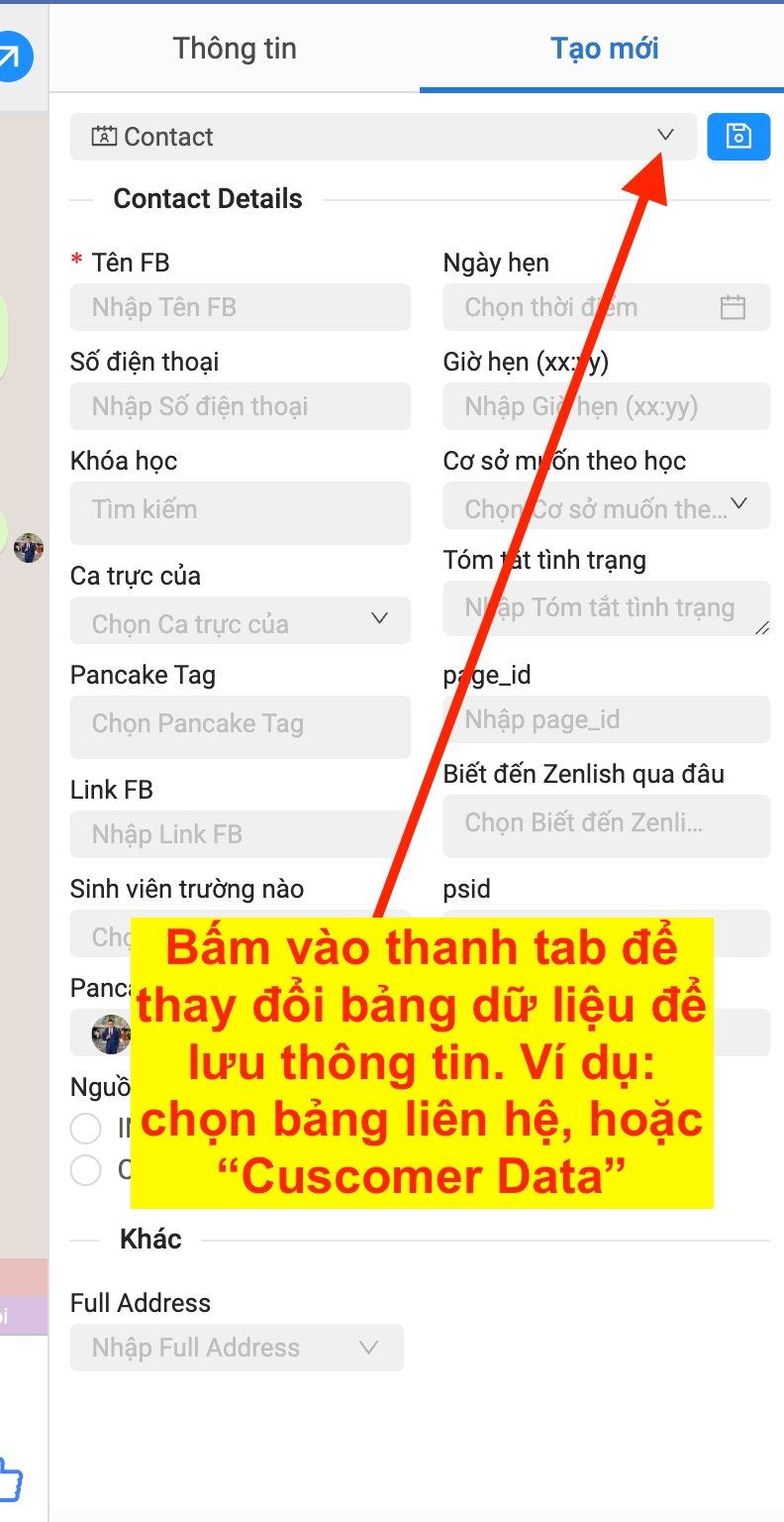 Step 2: Select the data table to save information. To choose the data table that suits your purpose (Specifically, MKT will work with the contact table tab and the Customer Data table)