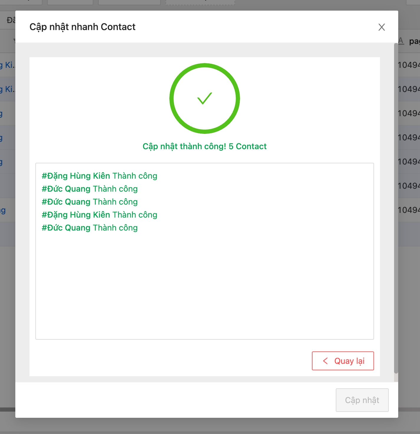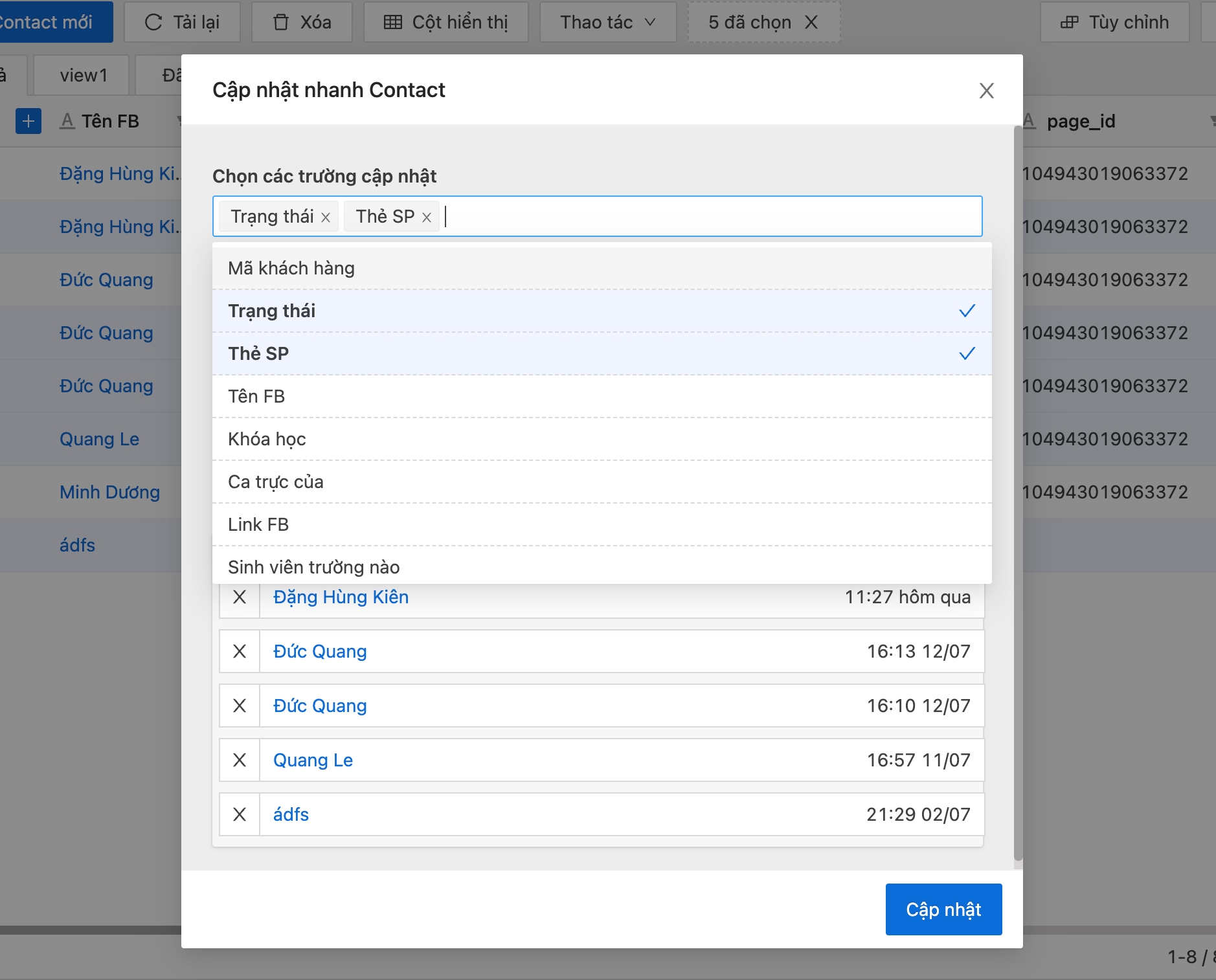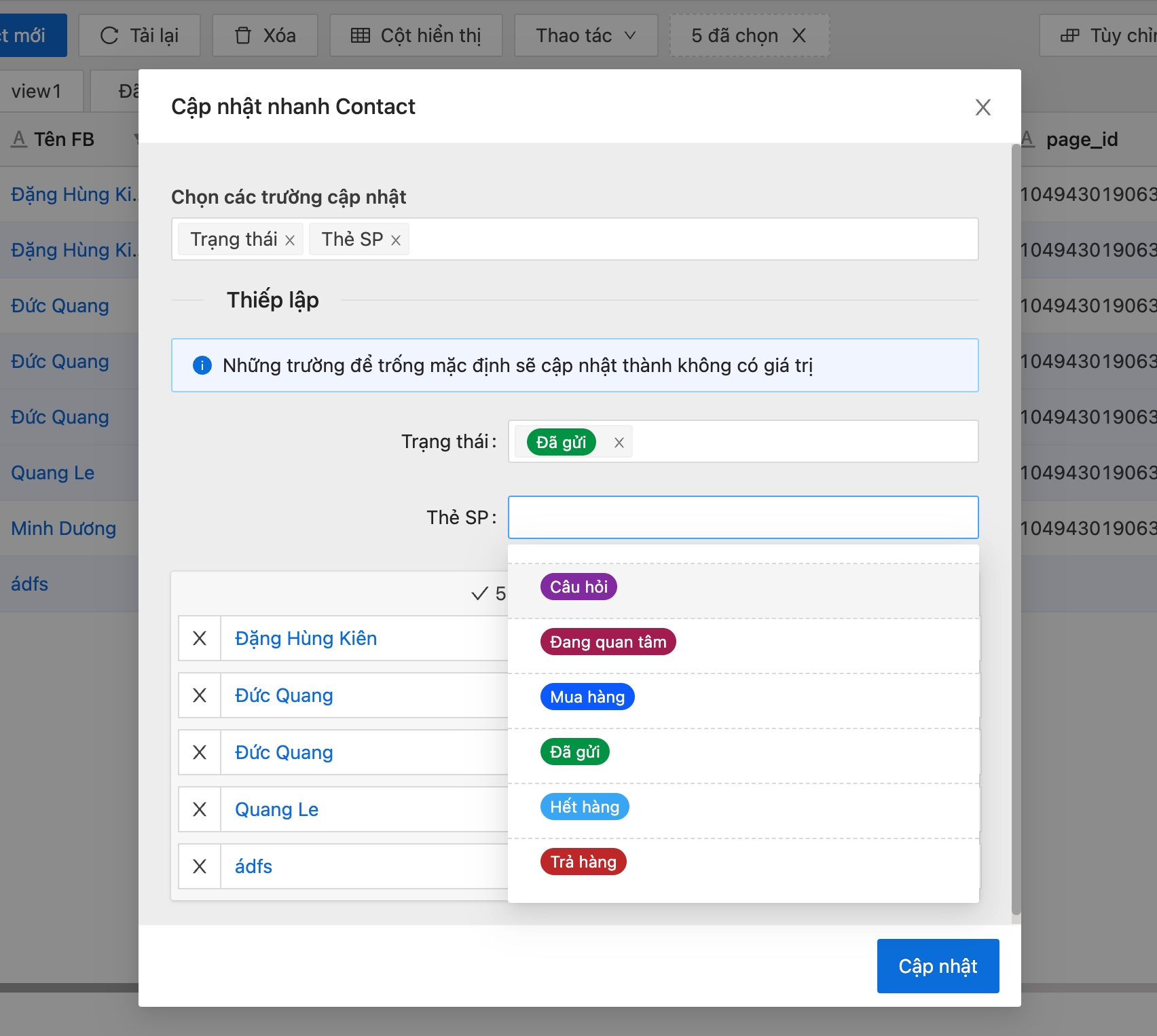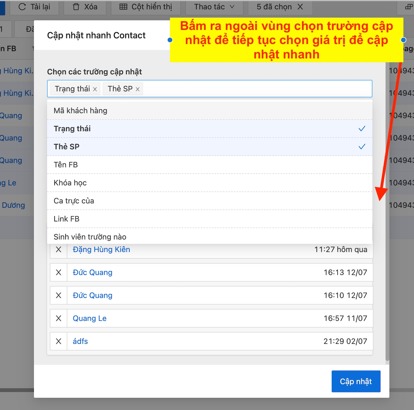 Bước 5: Chọn giá trị của trường để cập nhật nhanh các trường thông tin, sau đó bấm cập nhật để cập nhật nhanh