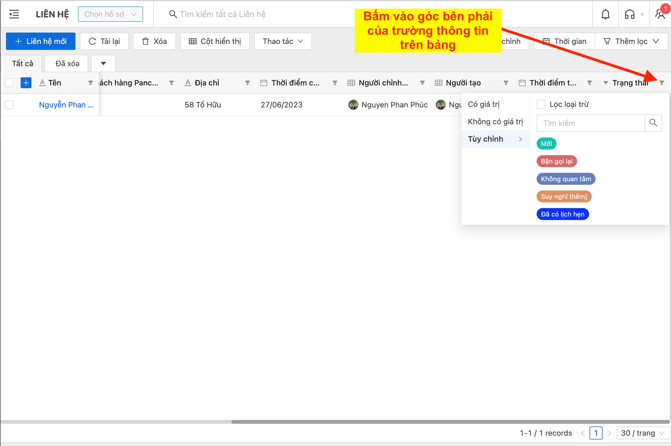 b. Cách thứ hai, lọc trực tiếp các trường thông tin ngay ở trên bảng.
