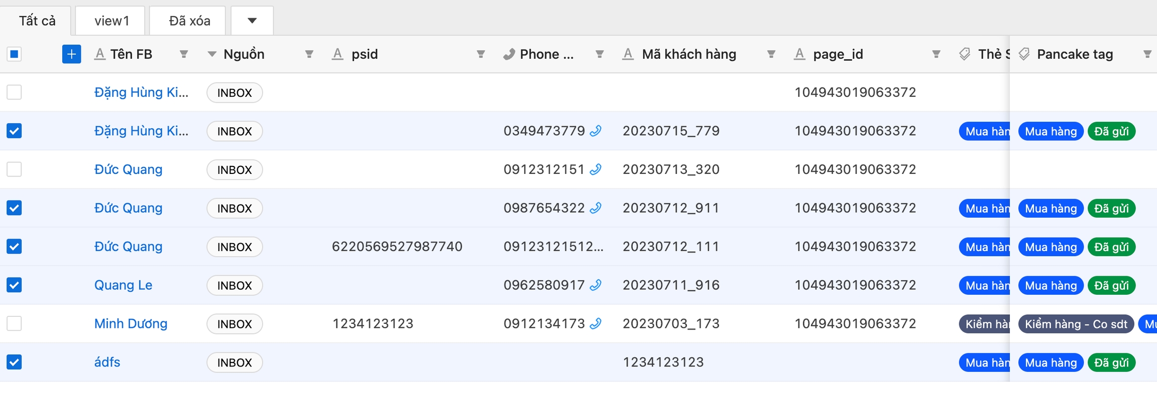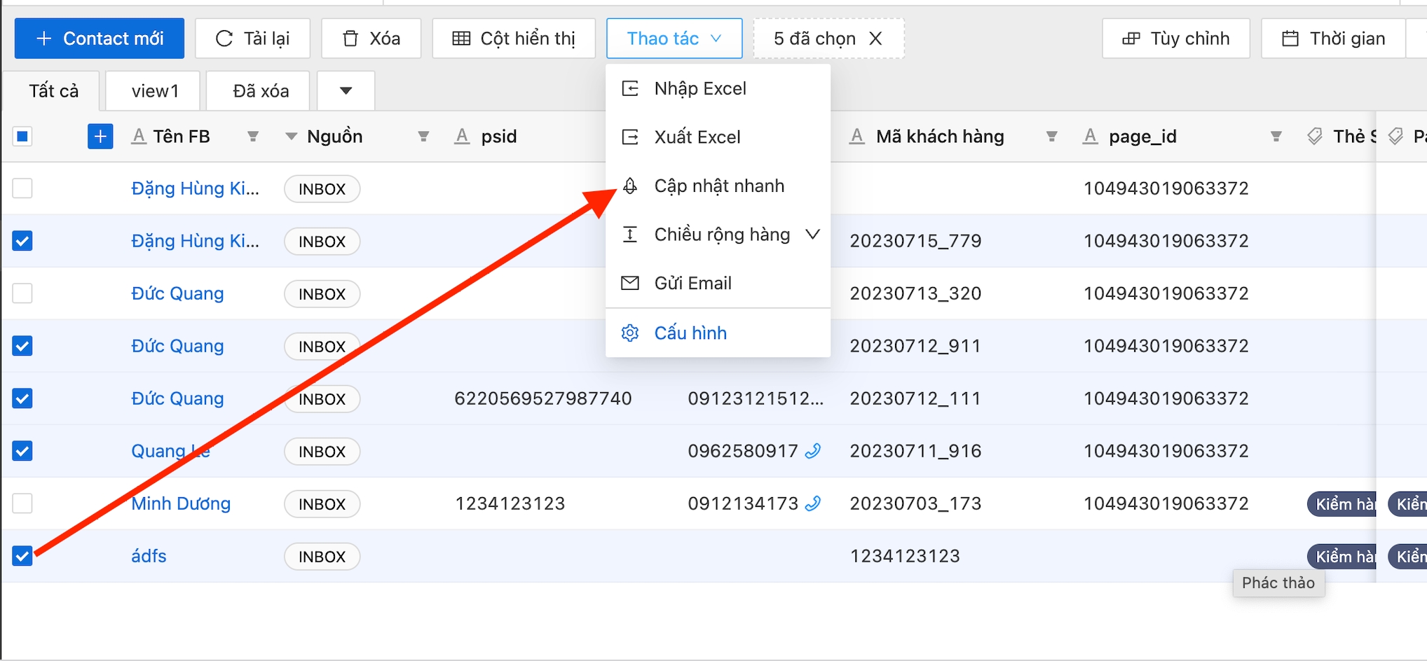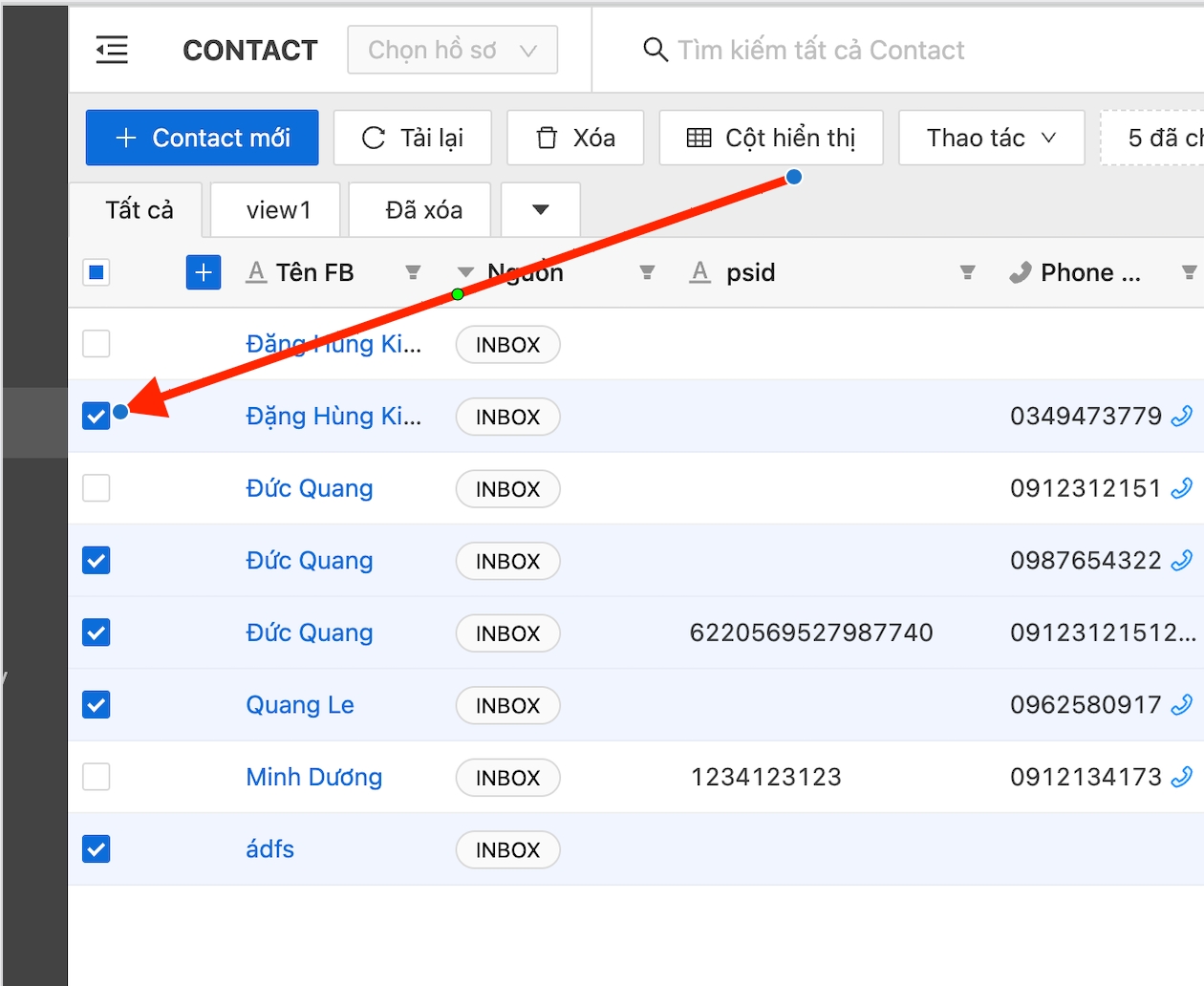 Bước 1: Chọn các liên hệ cần đồng bộ bằng cách tích vào các ô vuông nằm phía bên trái của liên hệ, dữ liệu của bảng
