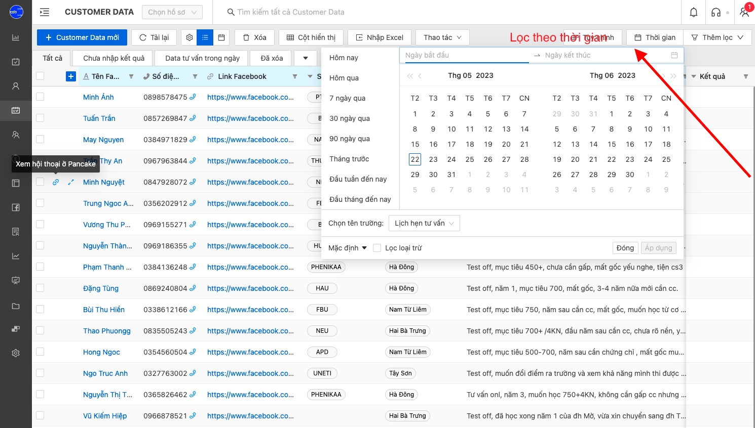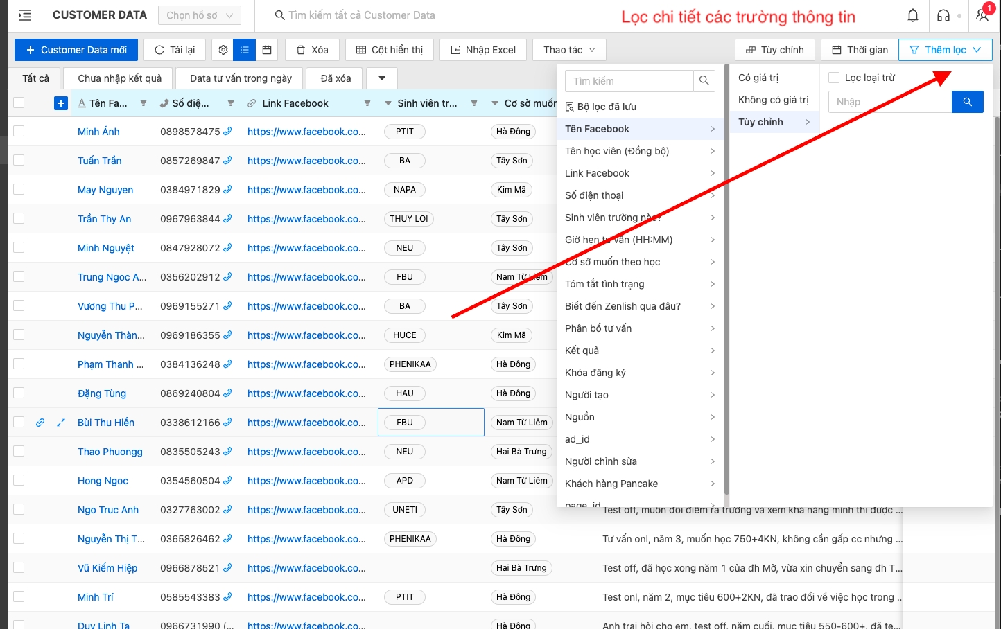 Các trường thông tin: có trong bảng đều lọc được bằng cách sử dụng tính năng lọc.