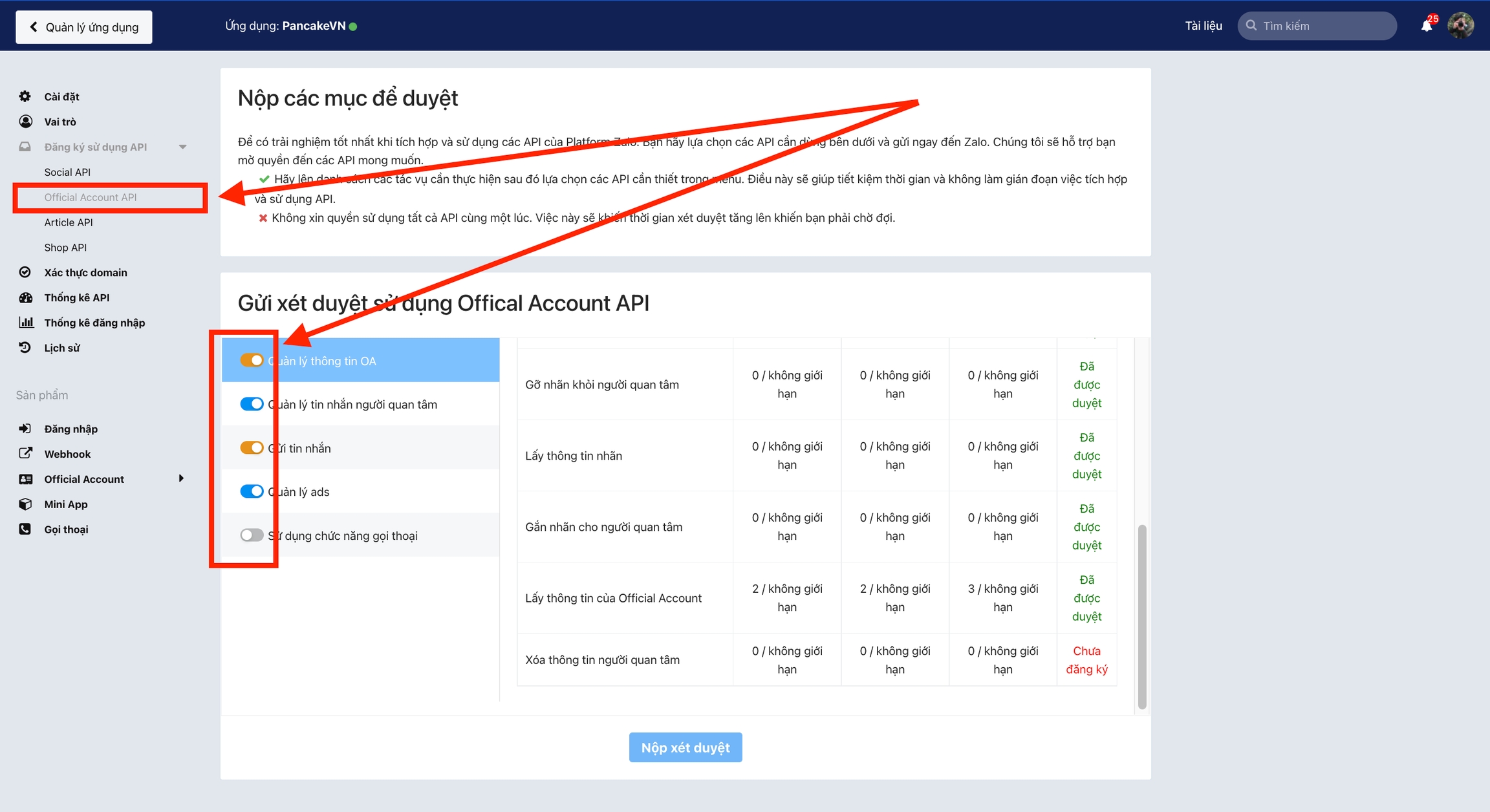 Bước 6: Tiếp theo, chọn đăng ký API official account => chọn mục nhỏ Official Account API, cài đặt theo nhu cầu sử dụng của bạn. Chọn xong bấm "Nộp xét duyệt"