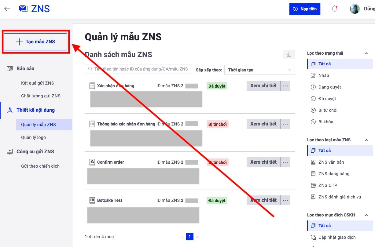 Link: để tạo tin nhắn tại: https://zalo.cloud/zns