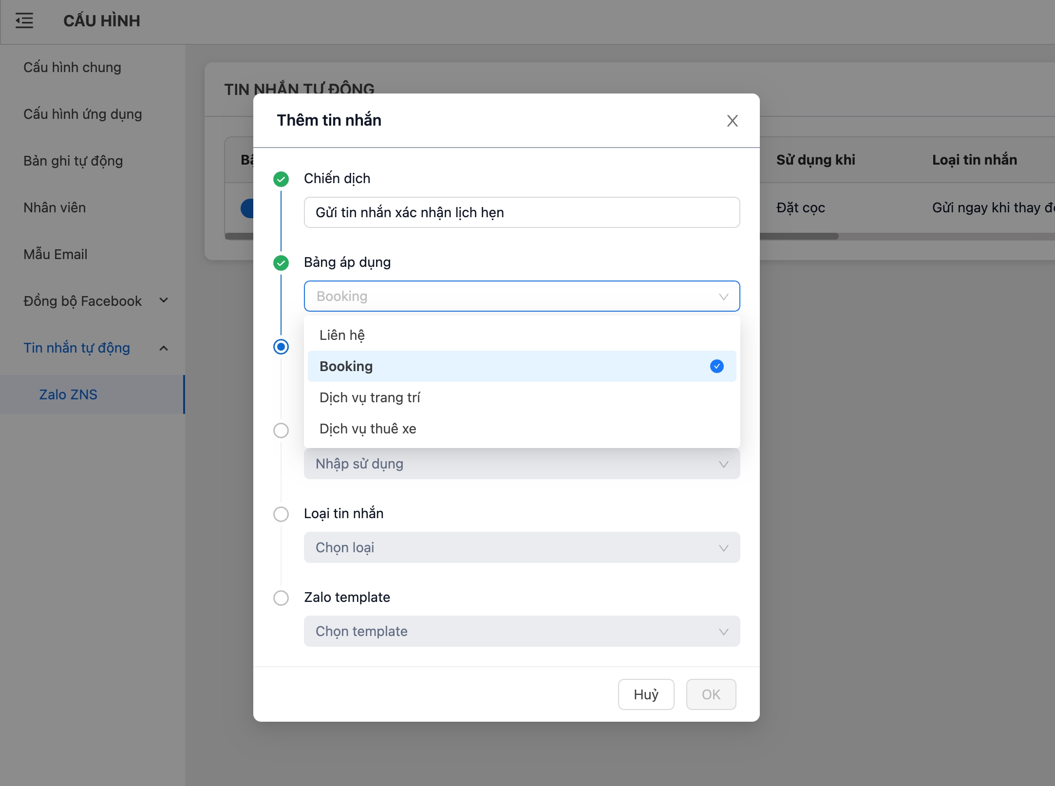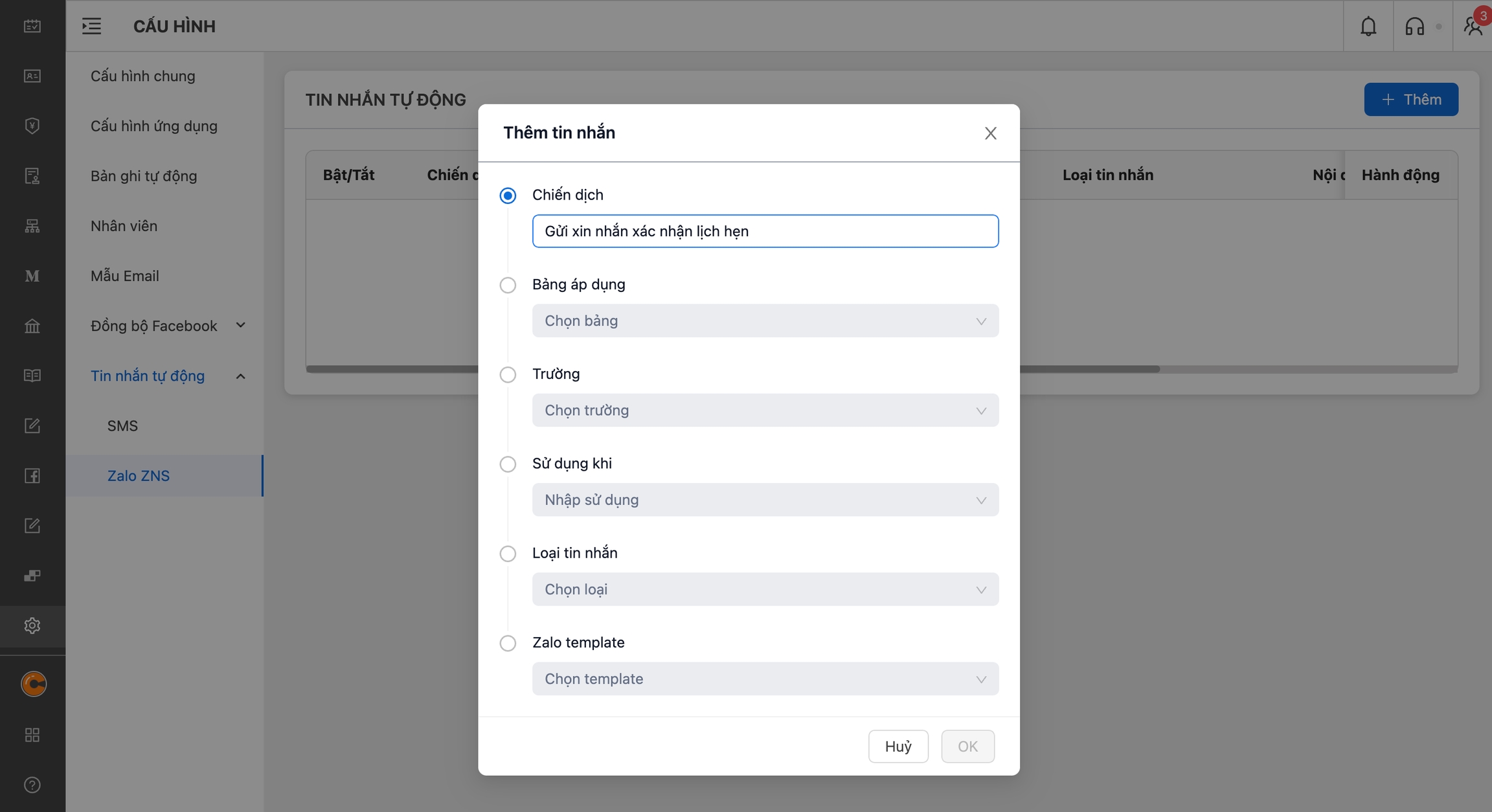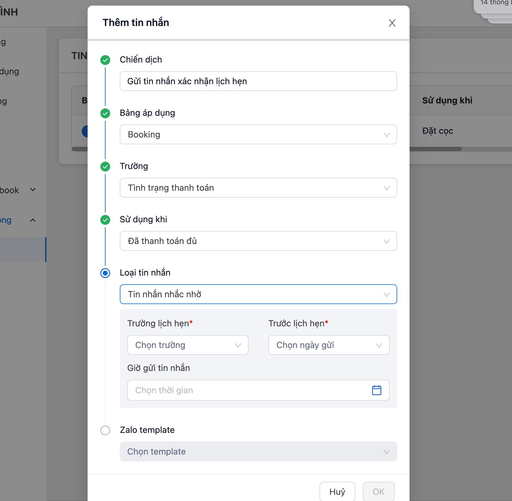 Với "Tin nhắn nhắc nhở" Mục đích cho việc nhắc nhở khách hàng trước lịch hẹn. Do vậy, đầu tiên ta cần chọn trường lịch hẹn => Chọn gửi trước lịch hẹn bao lâu? (Ví dụ: trước 1 ngày, 2 ngày, ...) => Chọn thời điểm gửi tin nhắn