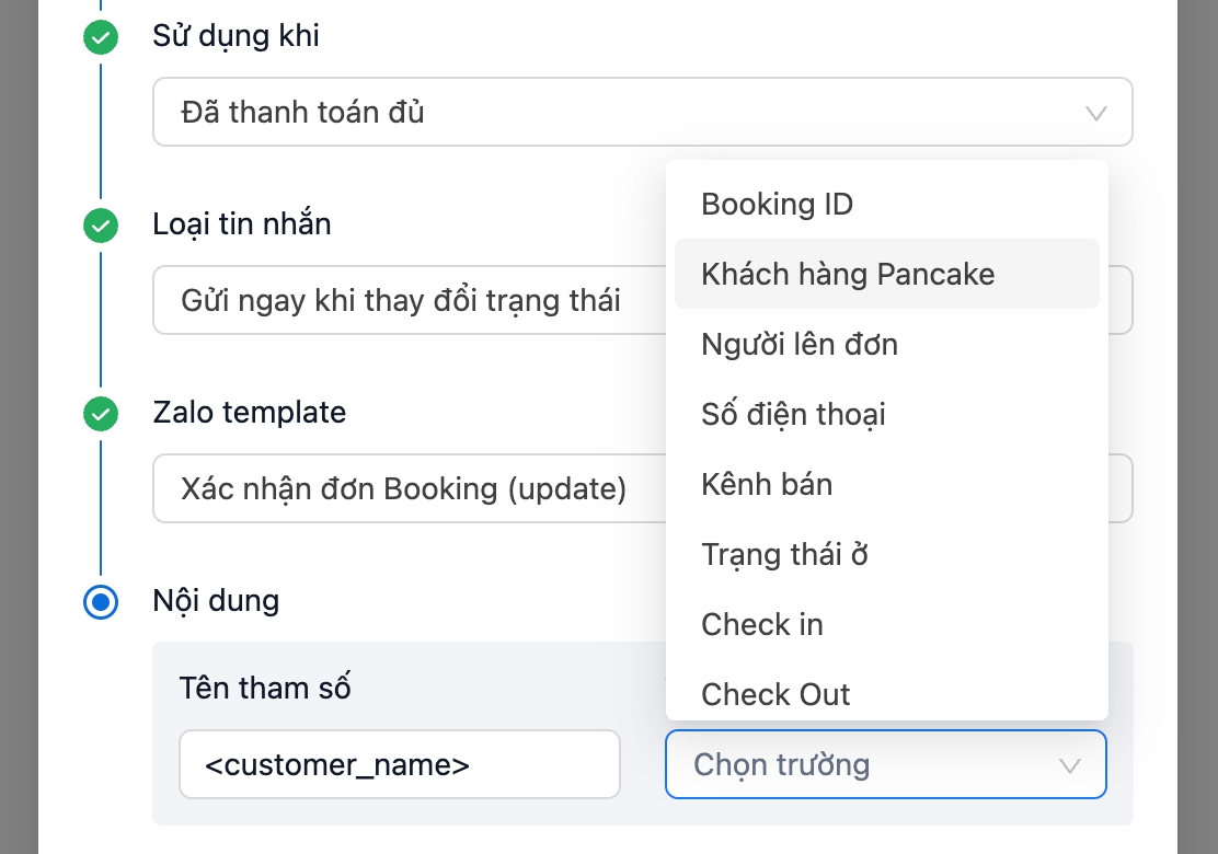 Chú ý 1: Cài đặt tham số Zalo ZNS template tương ứng với từ khóa của Pancake POS để đồng bộ dữ liệu. Ví dụ: FULL_NAME (Trên POS) => <full_name> (XNS)