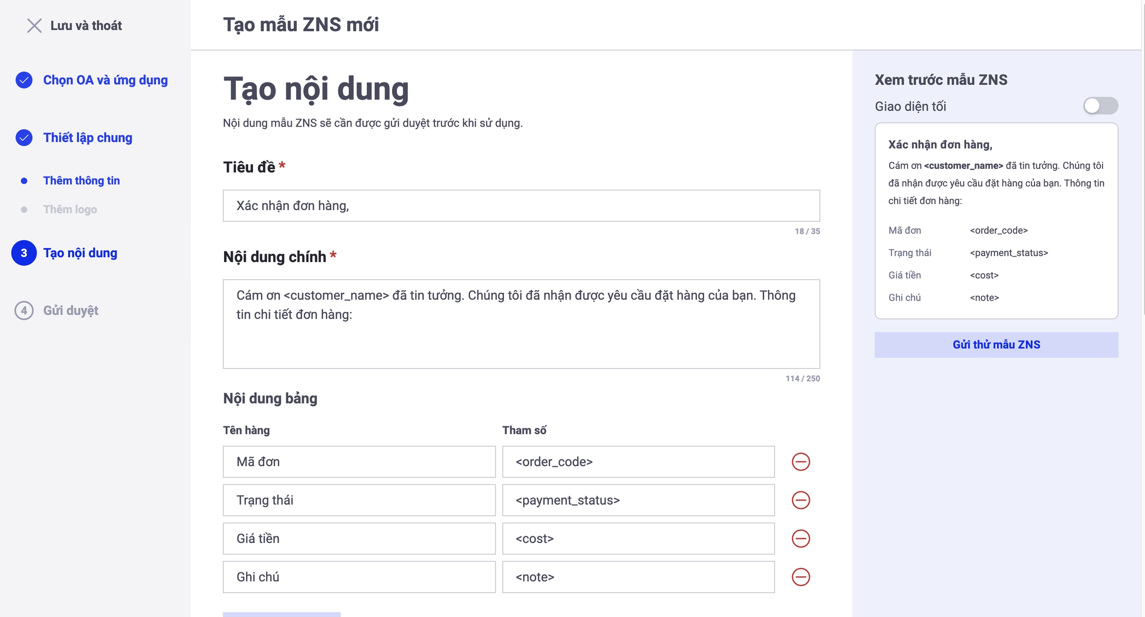 Tiếp theo, quay lại mẫu tin nhắn tự động Zalo ZNS ta đang thao tác dở, ta bấm dấu cộng ở phần nội dung