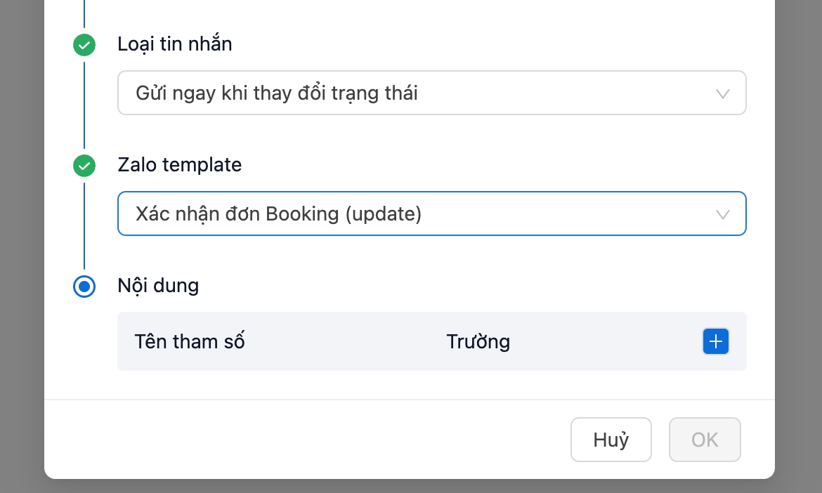 Bước 7: Nội dung. Khớp tham số ở mẫu Zalo với trường thông tin trên bảng của CRM