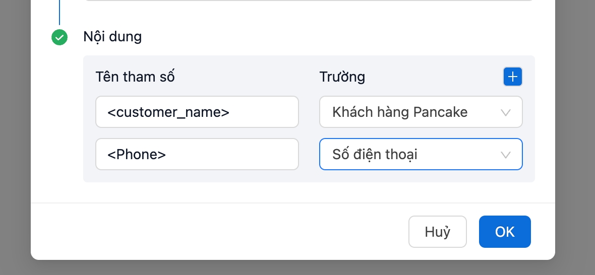 Đầu tiên, ta đối chiếu các tham số được thiết lập ở mẫu Zalo ZNS (Đã được duyệt) ta chọn ở Bước 6. Ví dụ, ta có hai tham số là tên khách hàng và số điện thoại, nếu nhiều hơn thì các làm cũng sẽ tương tự.