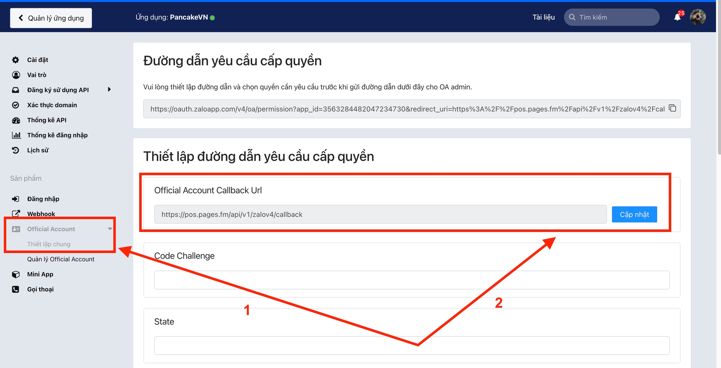 Bước 4: Tiếp theo chọn Official Account -> Thiết lập chung -> Điền call back url: "https://pos.pages.fm/api/v1/zalov4/callback"