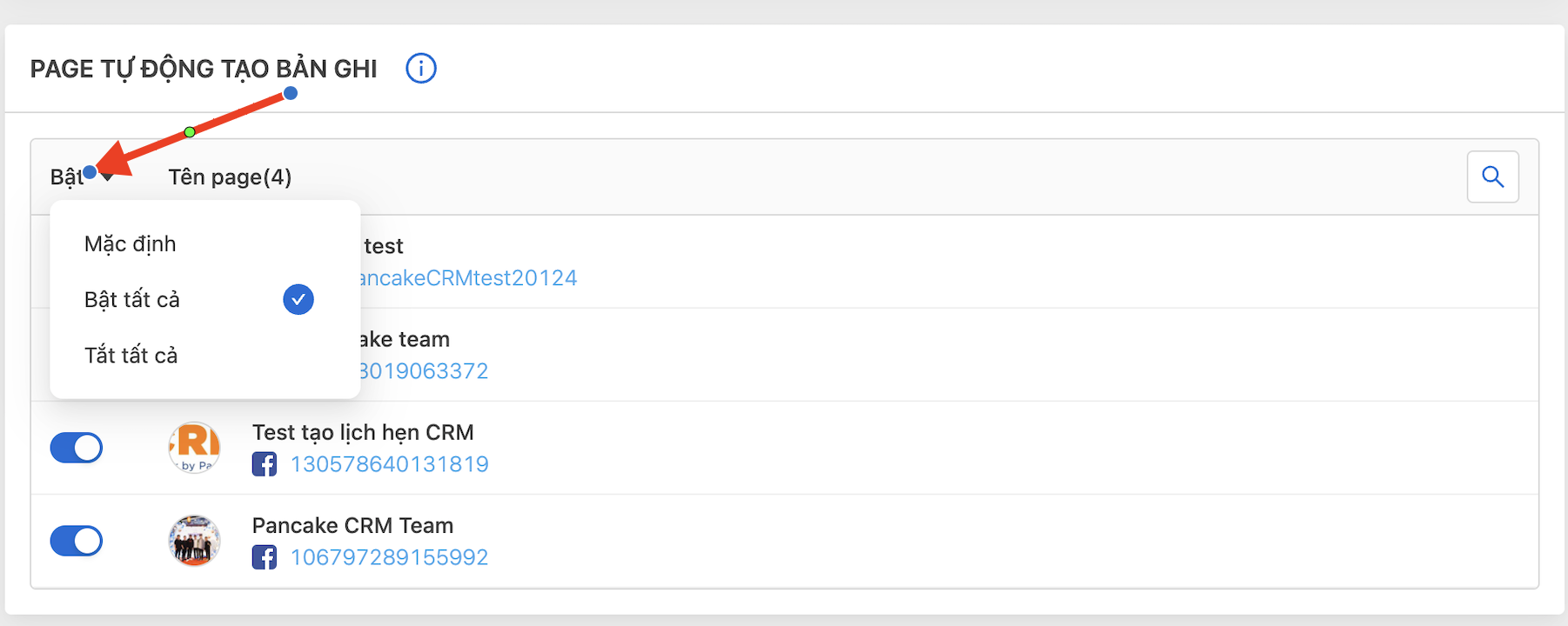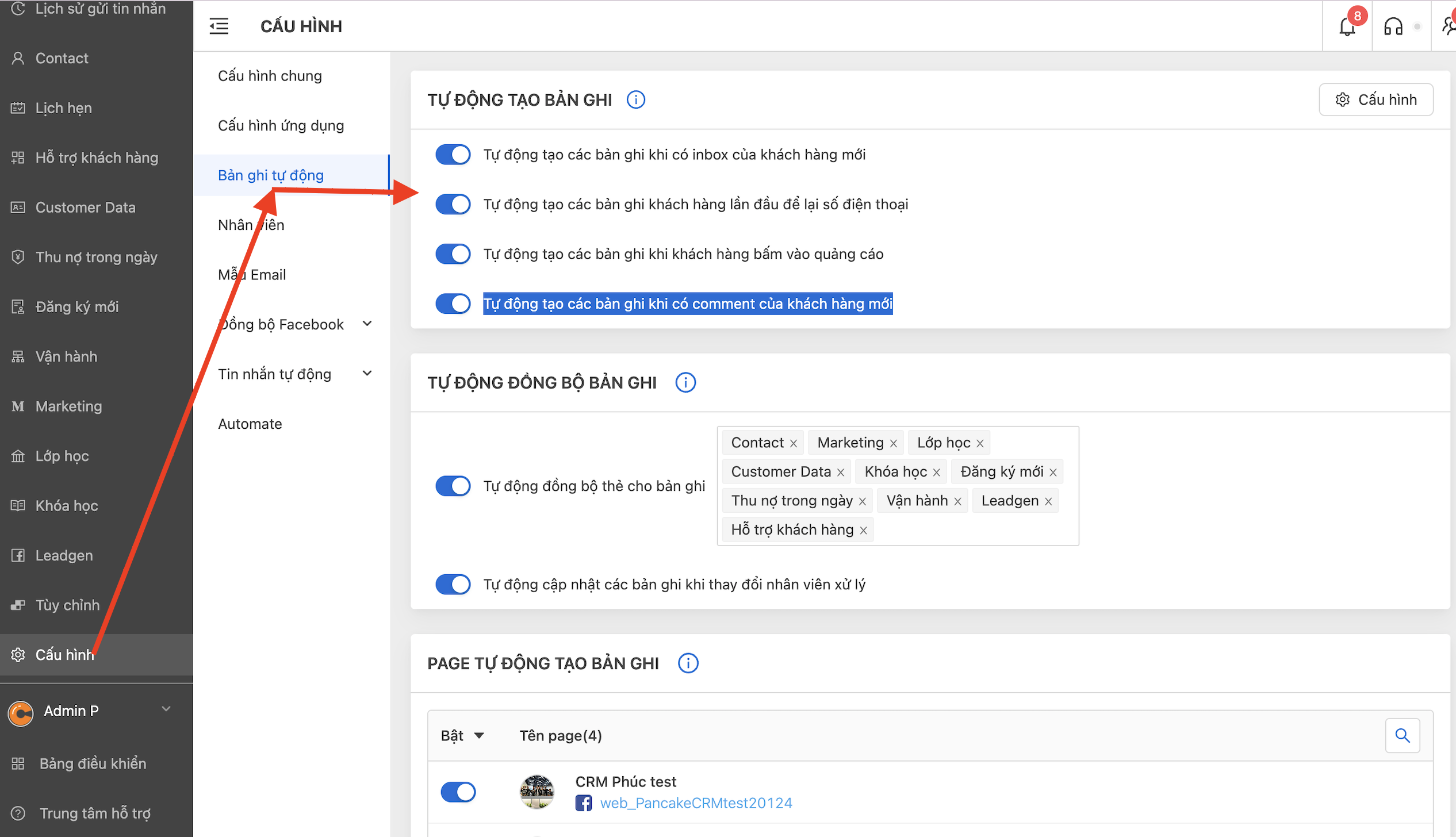 Chức năng tự động tạo bản ghi bạn muốn <mark style="color:orange;">**bật cho các page**</mark> vào thì sẽ bật ở đây.