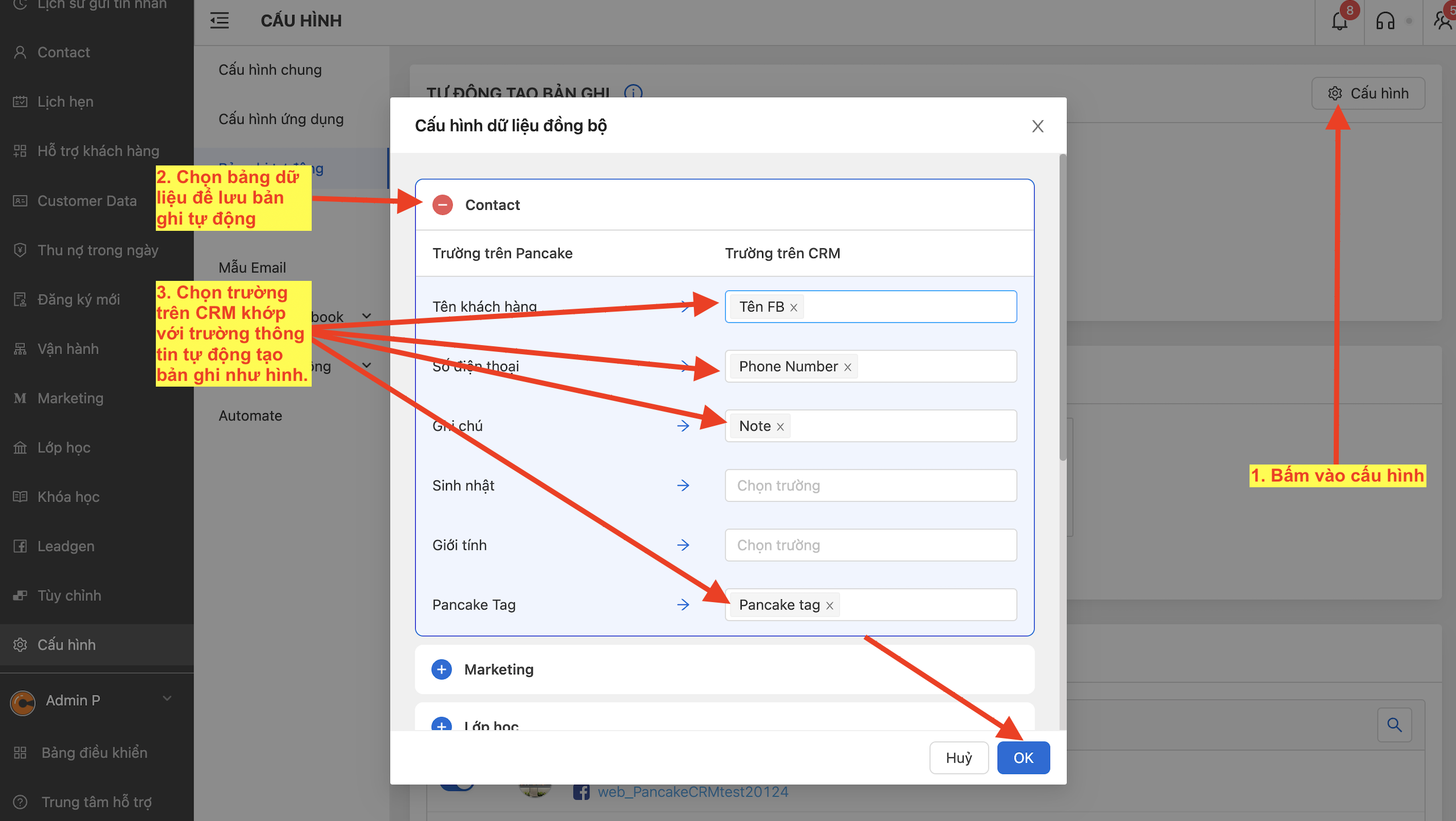 *<mark style="color:blue;">**Khi tích hợp sử dụng CRM cùng với Pancake**</mark>*, Hệ thống có thể tự động tạo liên hệ khi khách hàng mới:&#x20;