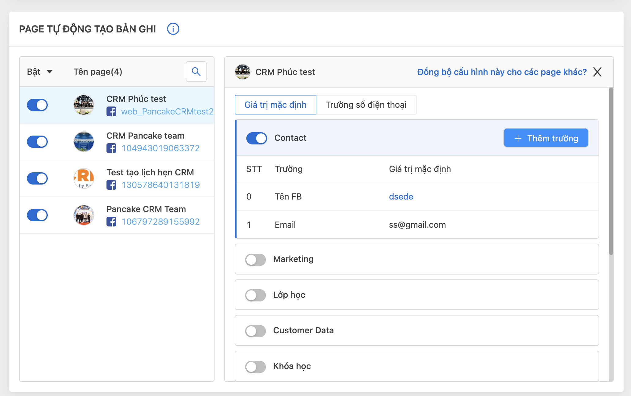 **Bước 5:** Bật các page tự động tạo bản ghi