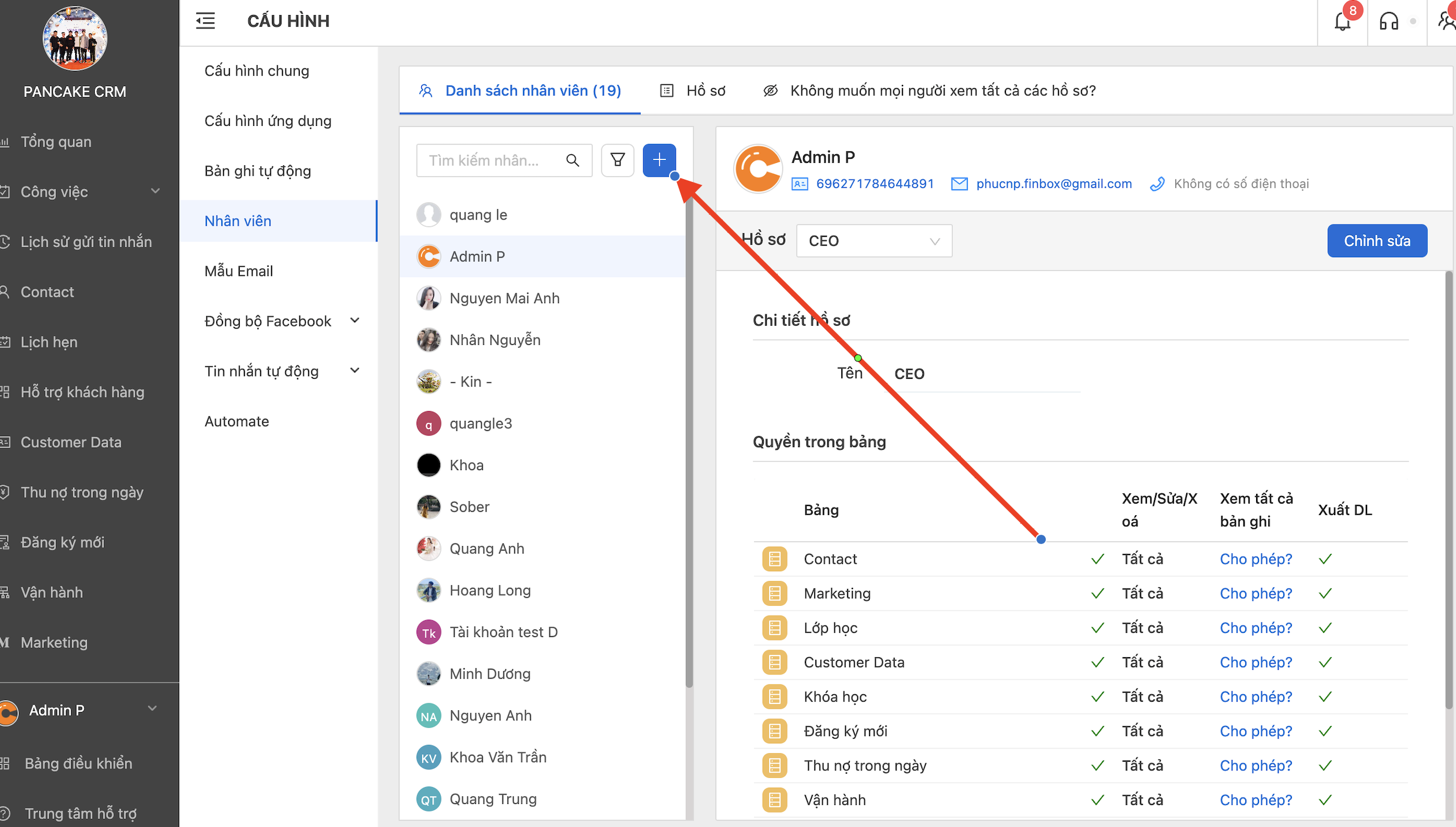 **Bước 2: Truy cập vào CRM của bạn:** Bạn có thể có nhiều Workspace CRM khác nhau, Truy cập vào CRM => Câus hình => Nhân viên => Thêm nhân viên (Button dấu cộng)&#x20;