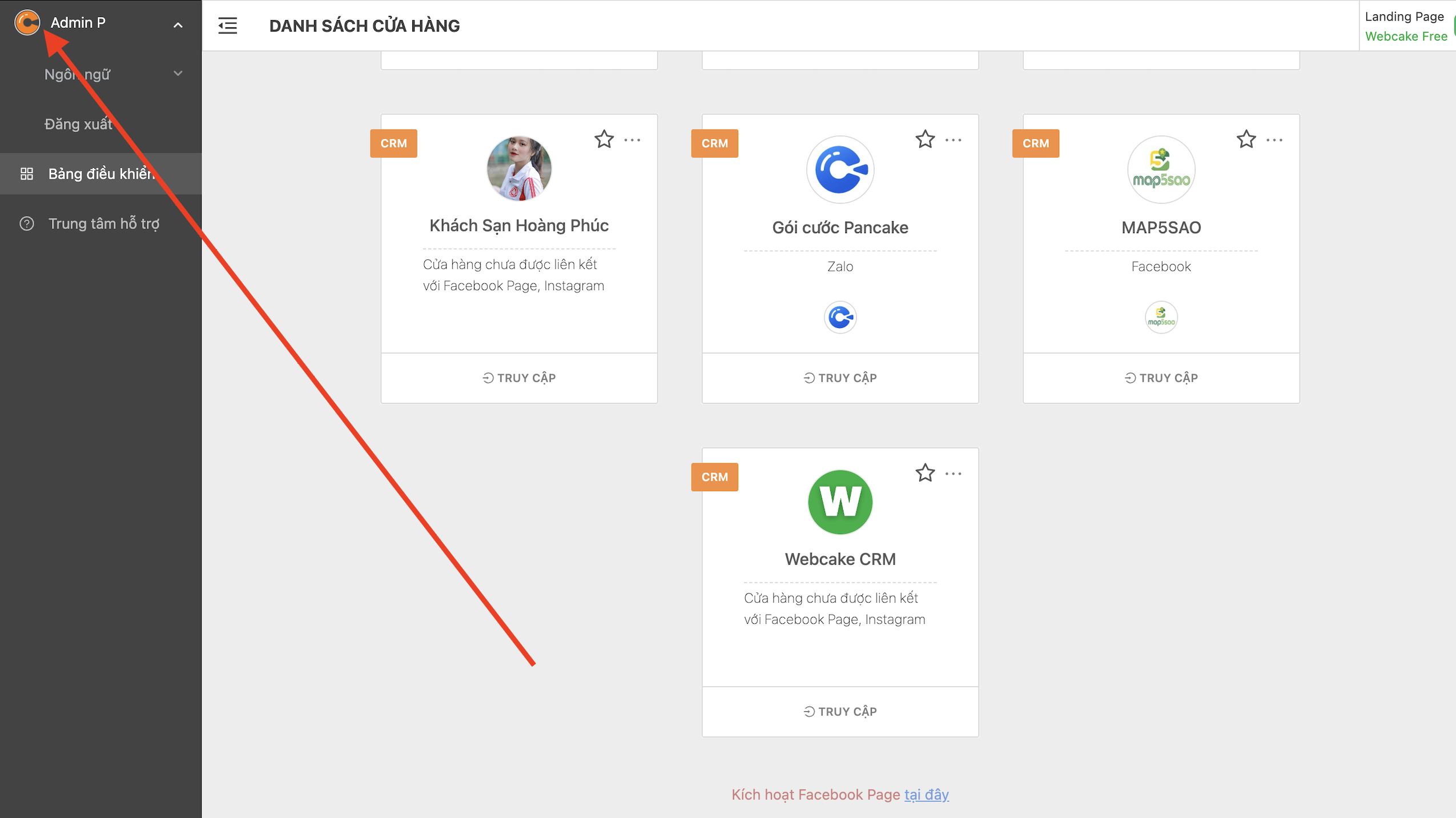 <mark style="color:blue;">**Đầu tiên, bấm vào tài khoản**</mark> khi nhân viên đã đăng nhập vào CRM ở **Bước 1.**