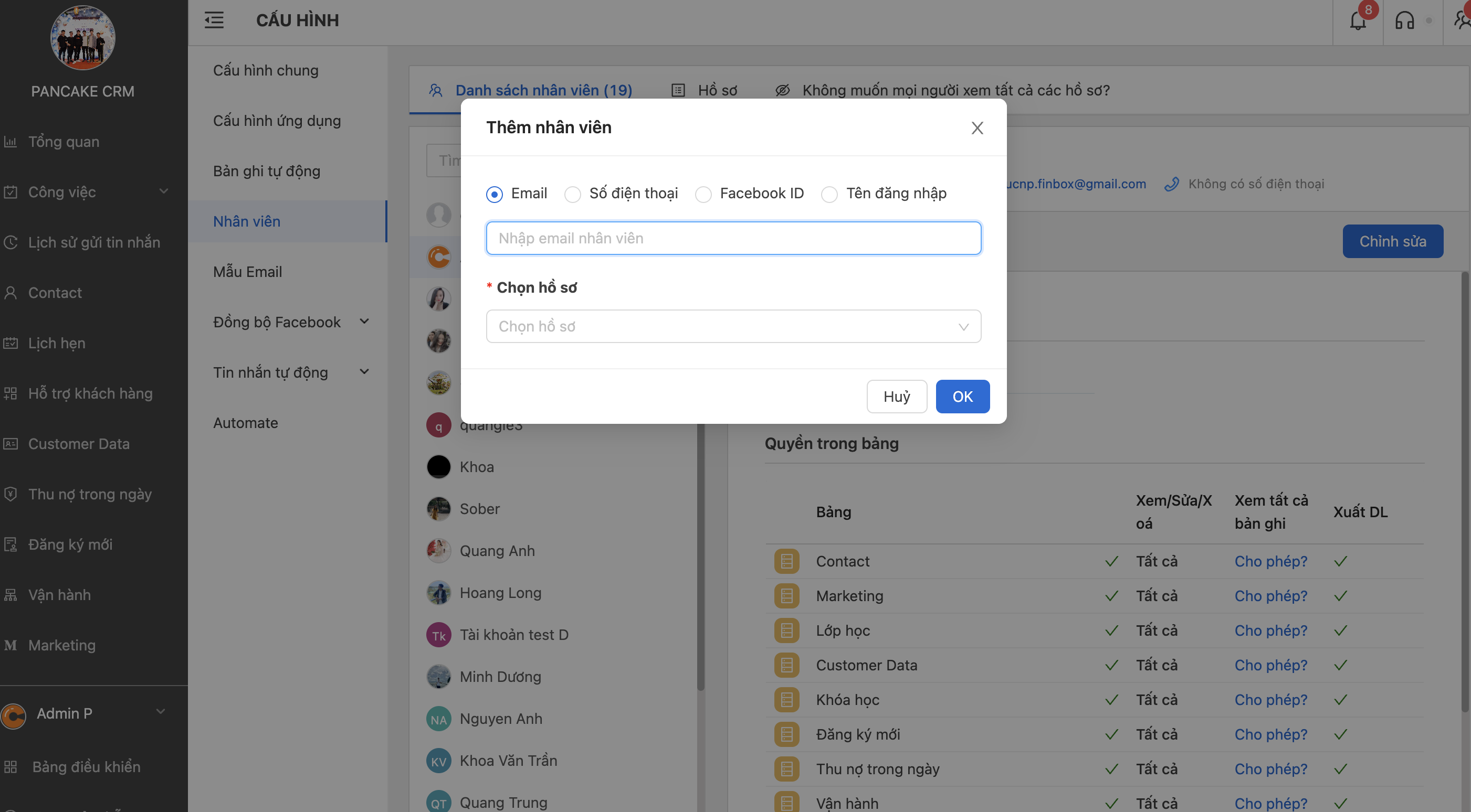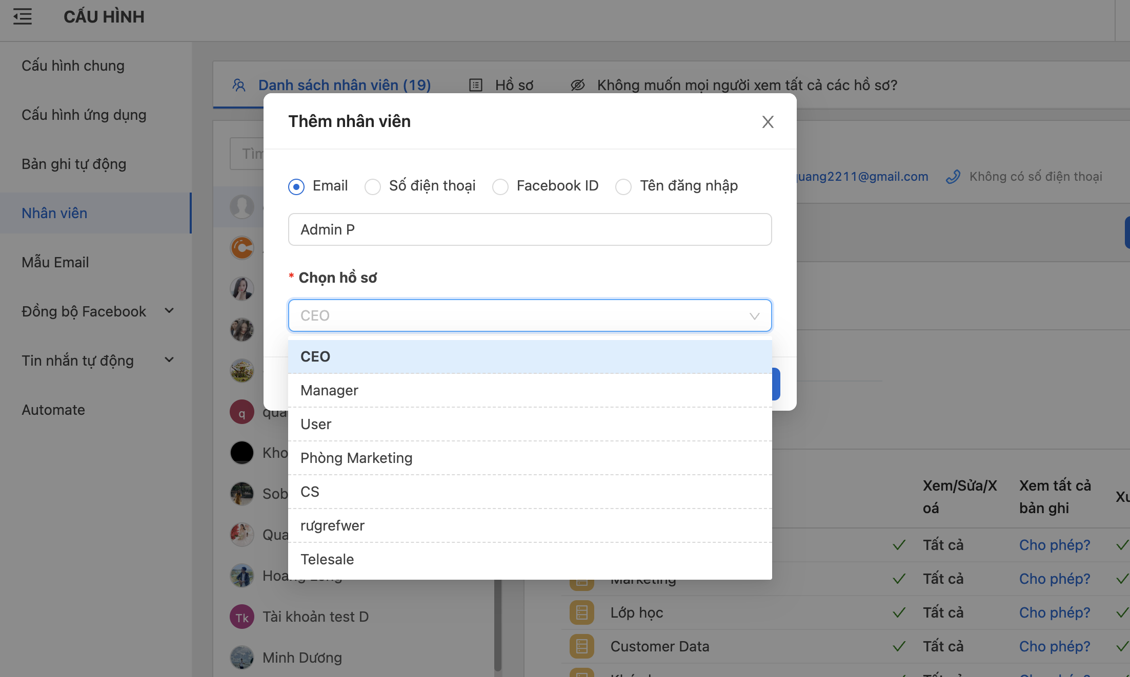 **Bước 3: Thêm nhân viên** bằng Mail, hoặc FB ID, hoặc tên nhân viên, hoặc số điện thoại