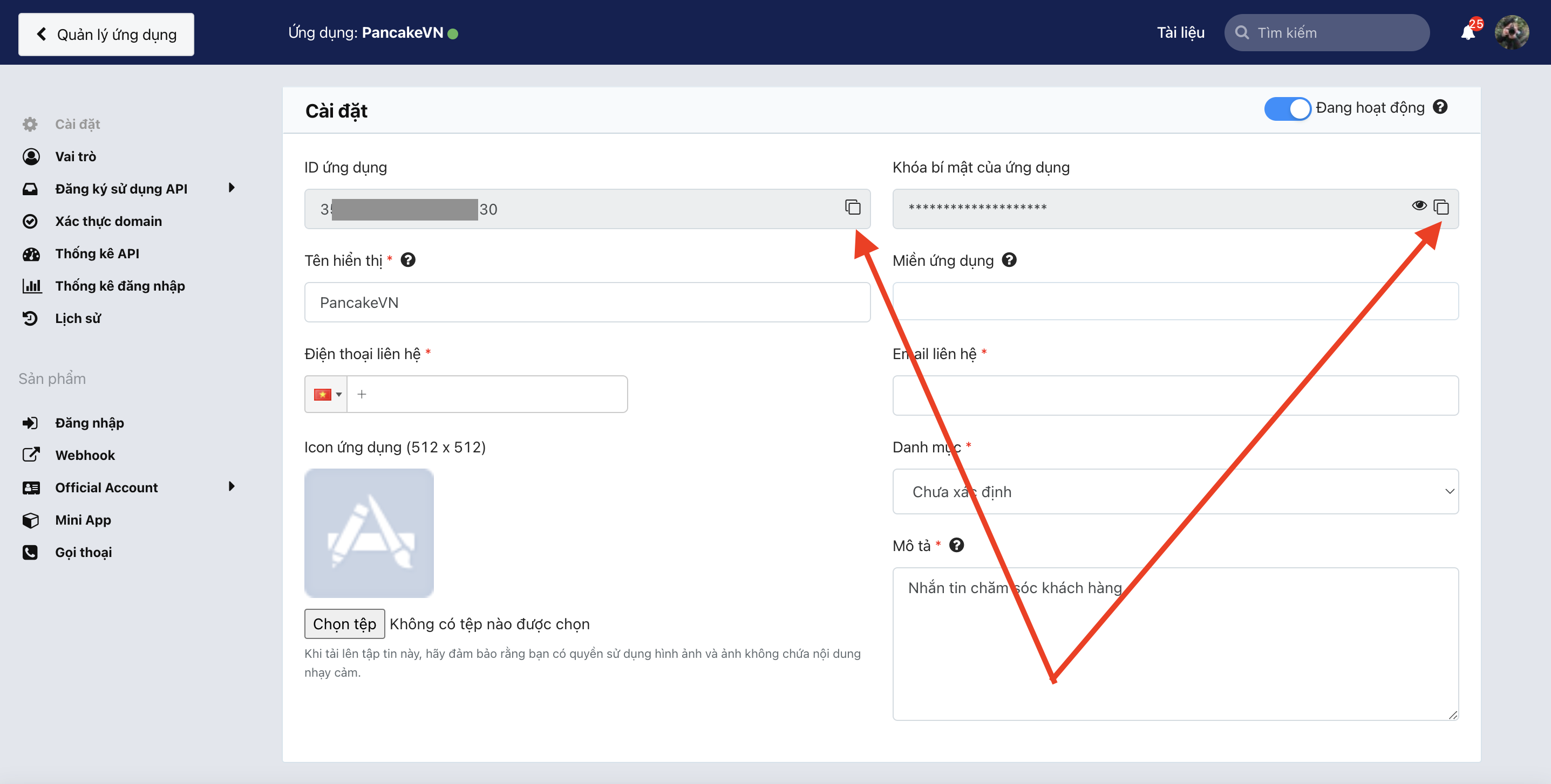 <figure><img src="https://961808962-files.gitbook.io/~/files/v0/b/gitbook-x-prod.appspot.com/o/spaces%2FXOUuQVhYSeLJNqAEHOIH%2Fuploads%2F1ToegC0S55wCAL6LGwEp%2Fimage.png?alt=media&#x26;token=e79d2dbf-aeca-4ffd-9f1a-af07979d3ff5" alt="" width="563"><figcaption><p>Chọn mục "Cài đặt" => Coppy ID ứng dụng và Khóa bí mât của ứng dụng vào Pancake POS</p></figcaption></figure>