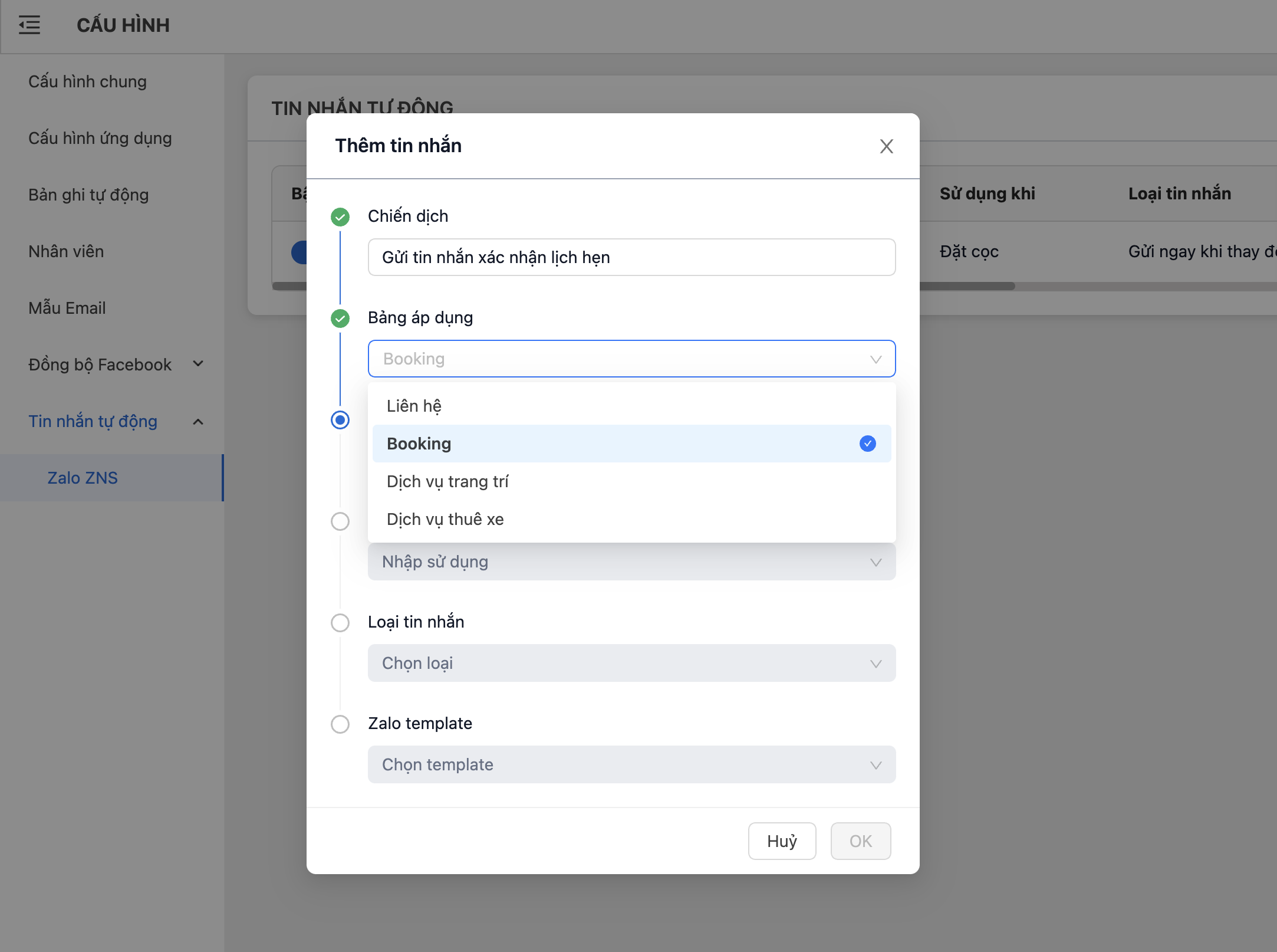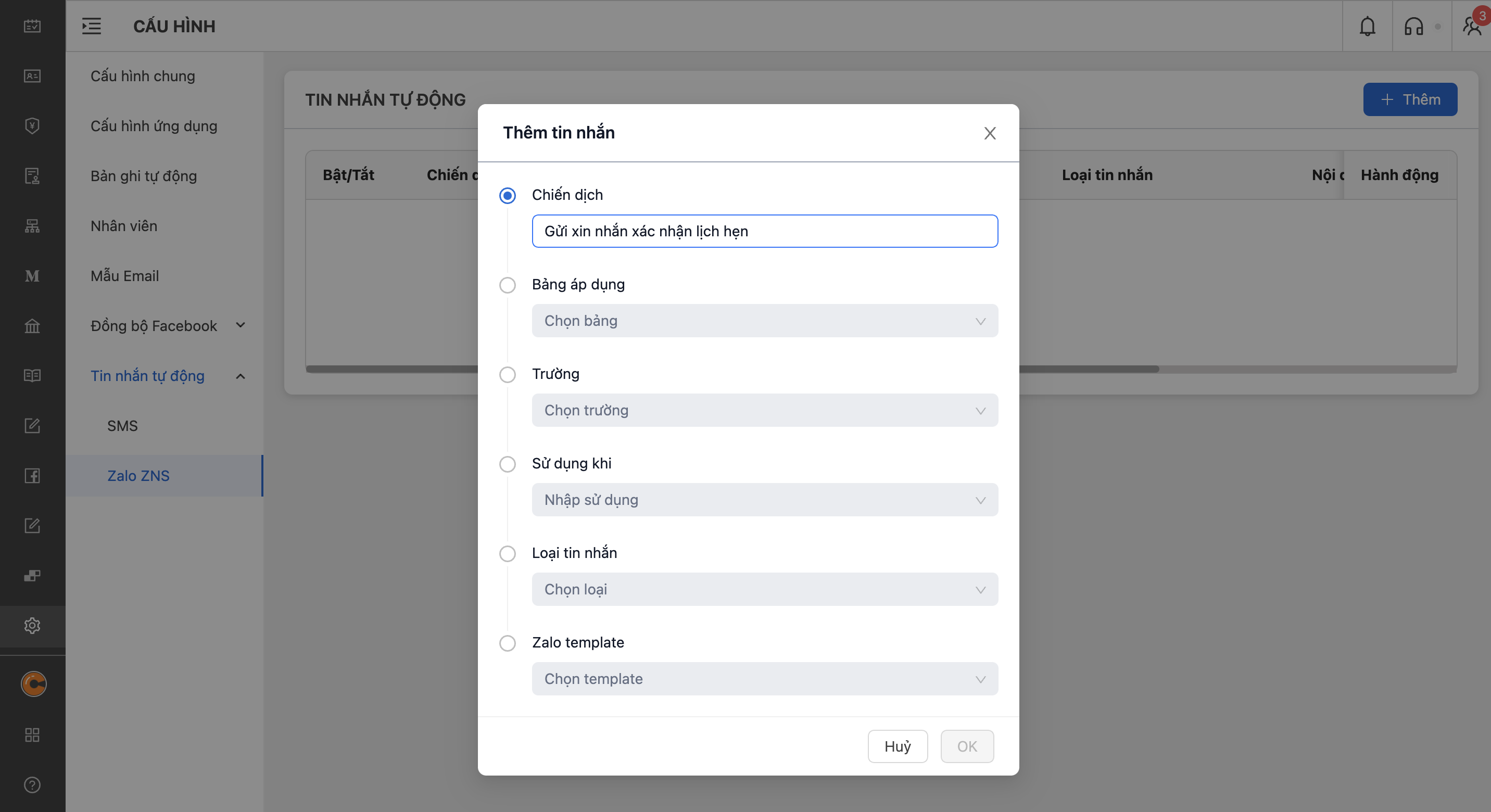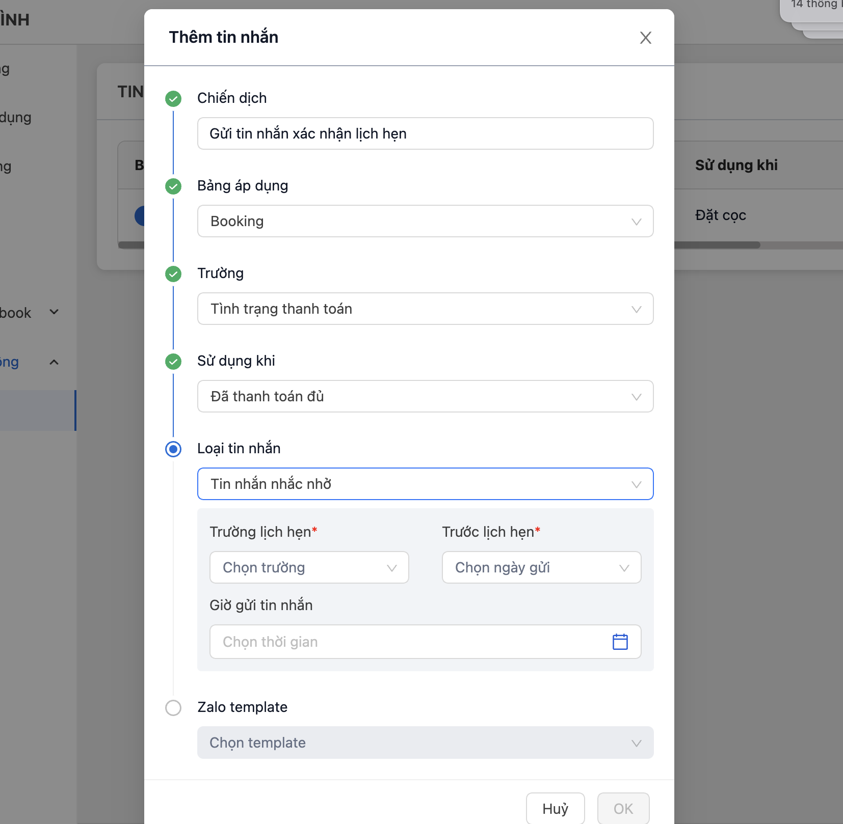 * ***Với "Tin nhắn nhắc nhở"*** Mục đích cho việc nhắc nhở khách hàng trước lịch hẹn. Do vậy, đầu tiên ta cần chọn trường lịch hẹn => Chọn gửi trước lịch hẹn bao lâu? (Ví dụ: trước 1 ngày, 2 ngày, ...) => Chọn thời điểm gửi tin nhắn
