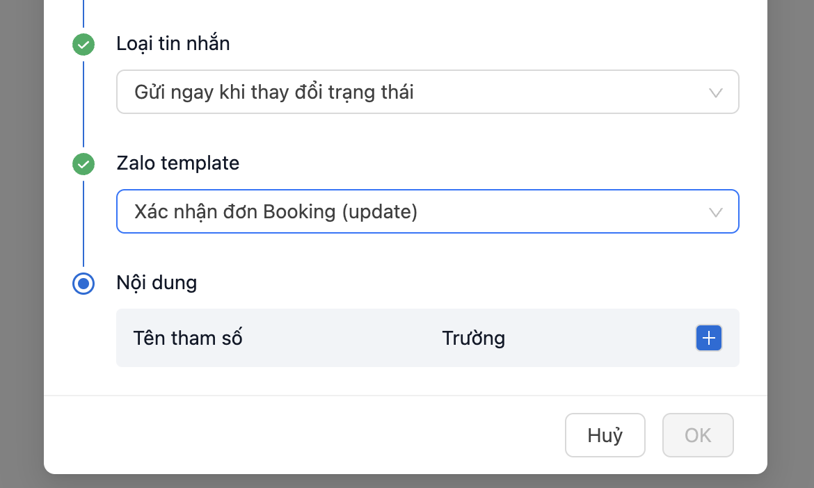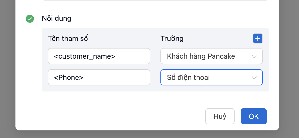 * Nếu mẫu ZNS có nhiều tham số, tương tự ta bấm thêm dấu cộng, thao tác tương tự để khớp tất cả tham số trên ZNS với các trường thông tin trong bảng của CRM.