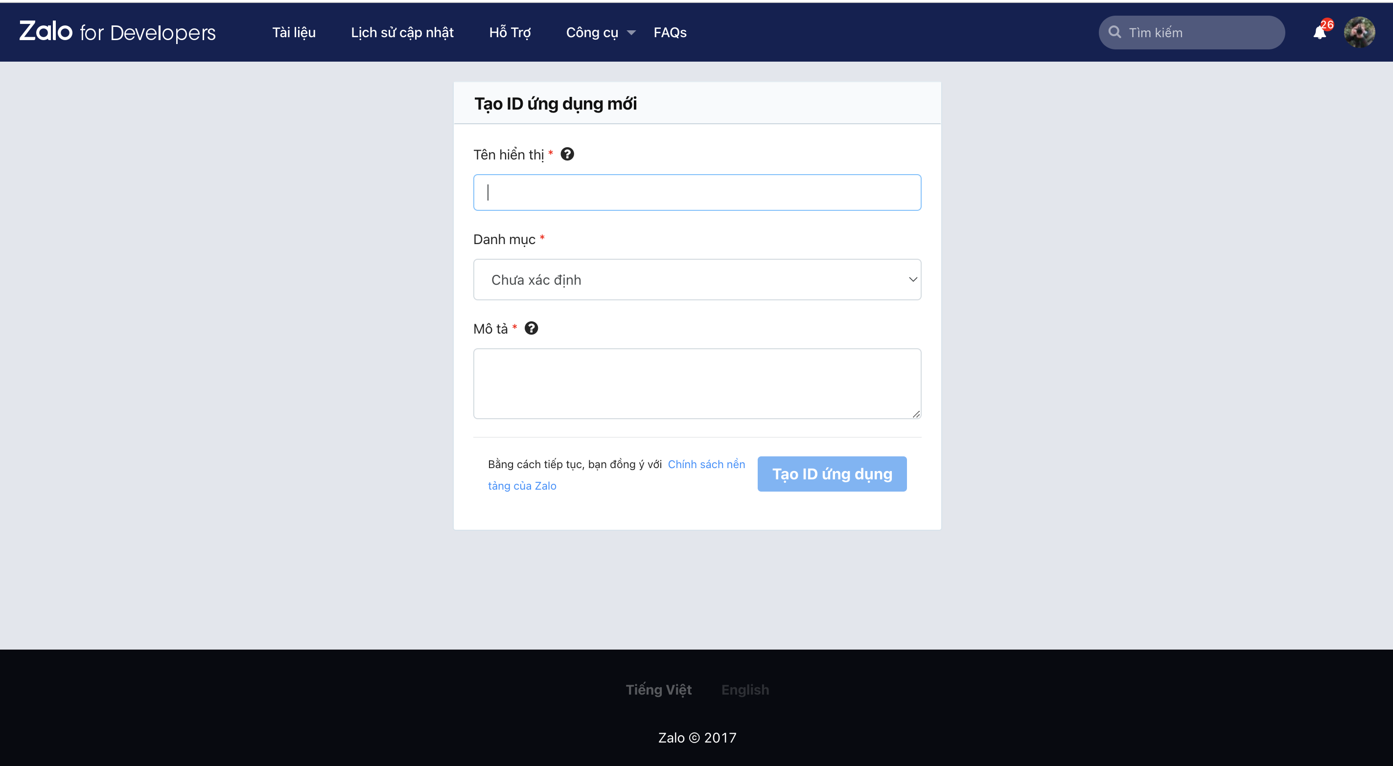 <figure><img src="https://961808962-files.gitbook.io/~/files/v0/b/gitbook-x-prod.appspot.com/o/spaces%2FXOUuQVhYSeLJNqAEHOIH%2Fuploads%2FKo3GPUIPTEDUjbqtm6aP%2Fimage.png?alt=media&#x26;token=46d5e0b7-6a6c-4657-ab77-56d11599298b" alt="" width="563"><figcaption><p>Tạo ID ứng dụng mới</p></figcaption></figure>