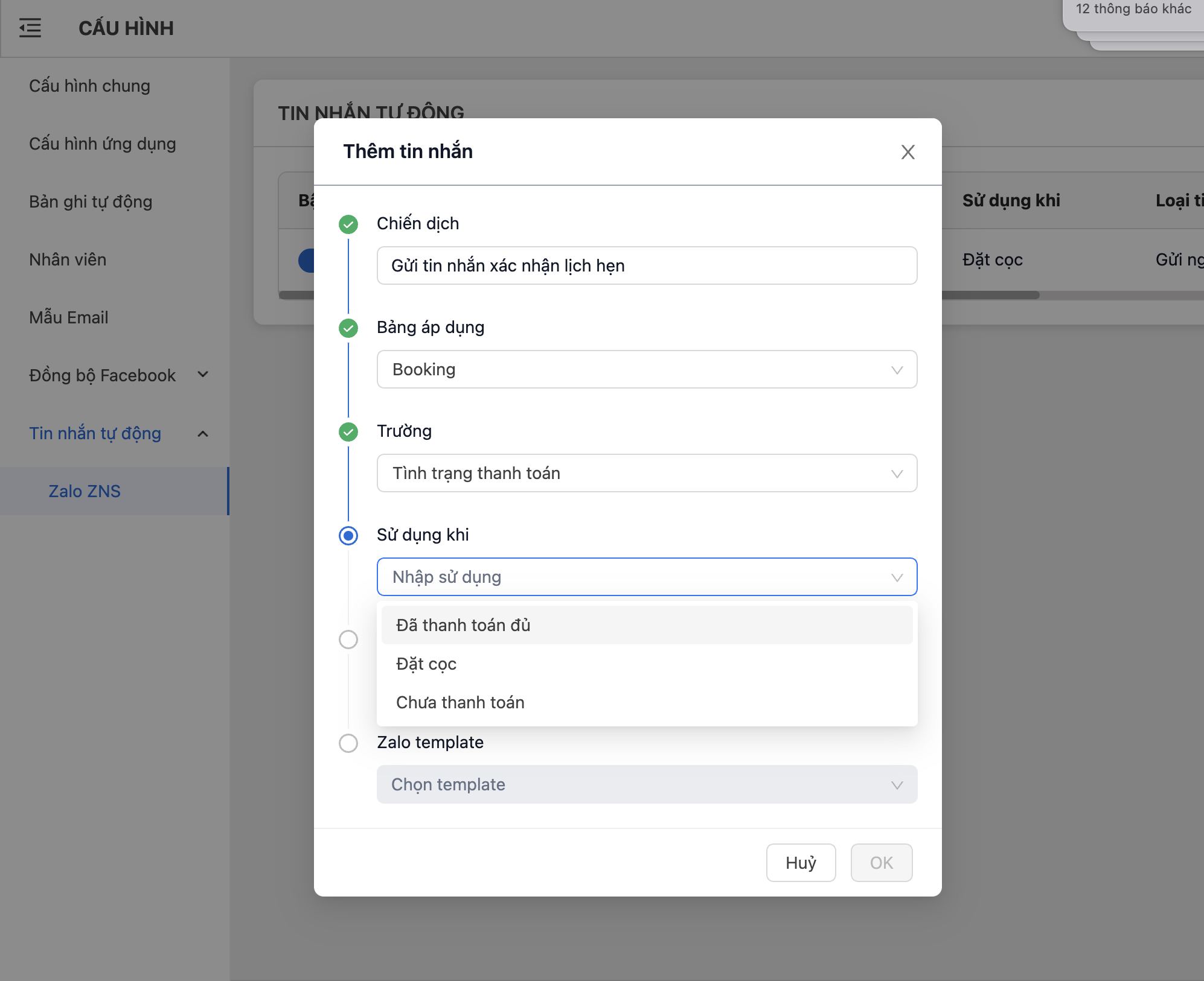 **Bước 4: Chọn sử dụng khi.** Khi chọn trường thông tin ở **Bước 3** xong, đây là bước chọn điều kiện chi tiết nhất để gửi thông tin nhắn. Ví dụ: "Chọn sử dụng khi trường chuyển thành "Đã Thanh toán đủ"