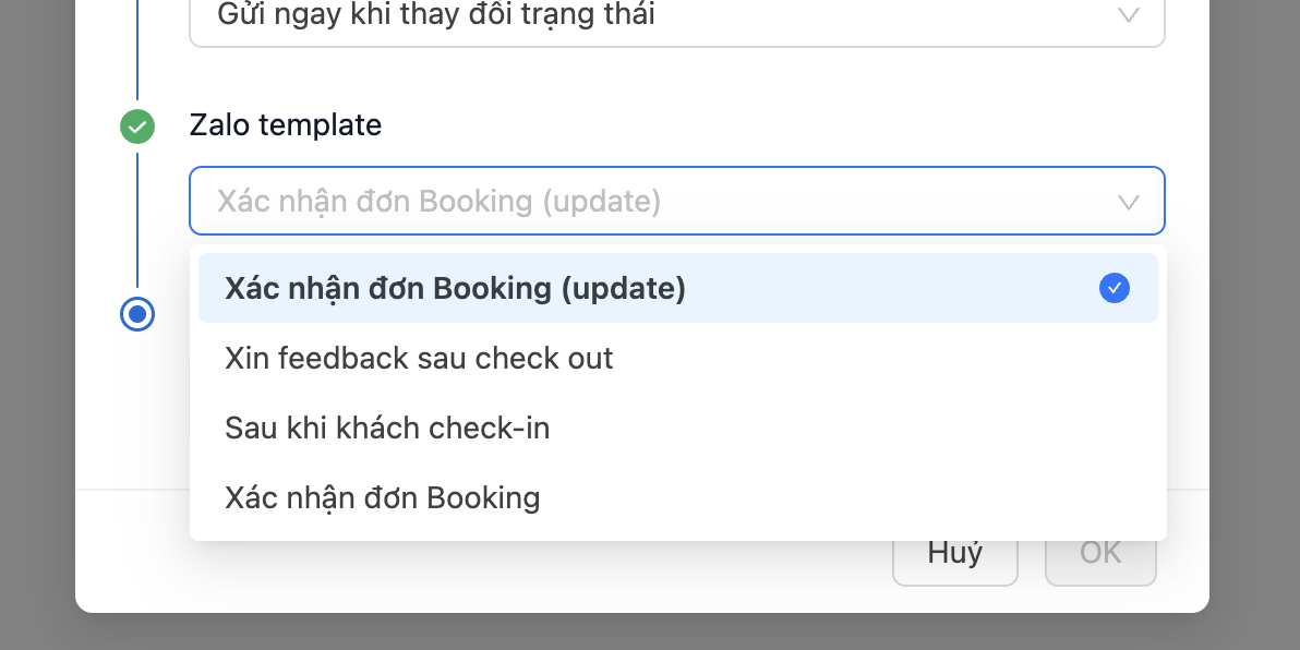 **Bước 5:** Chọn hình thức gửi tin nhắn, gửi ngay sau khi thay đổi trạng thái hoặc tin nhắn nhắc nhở.
