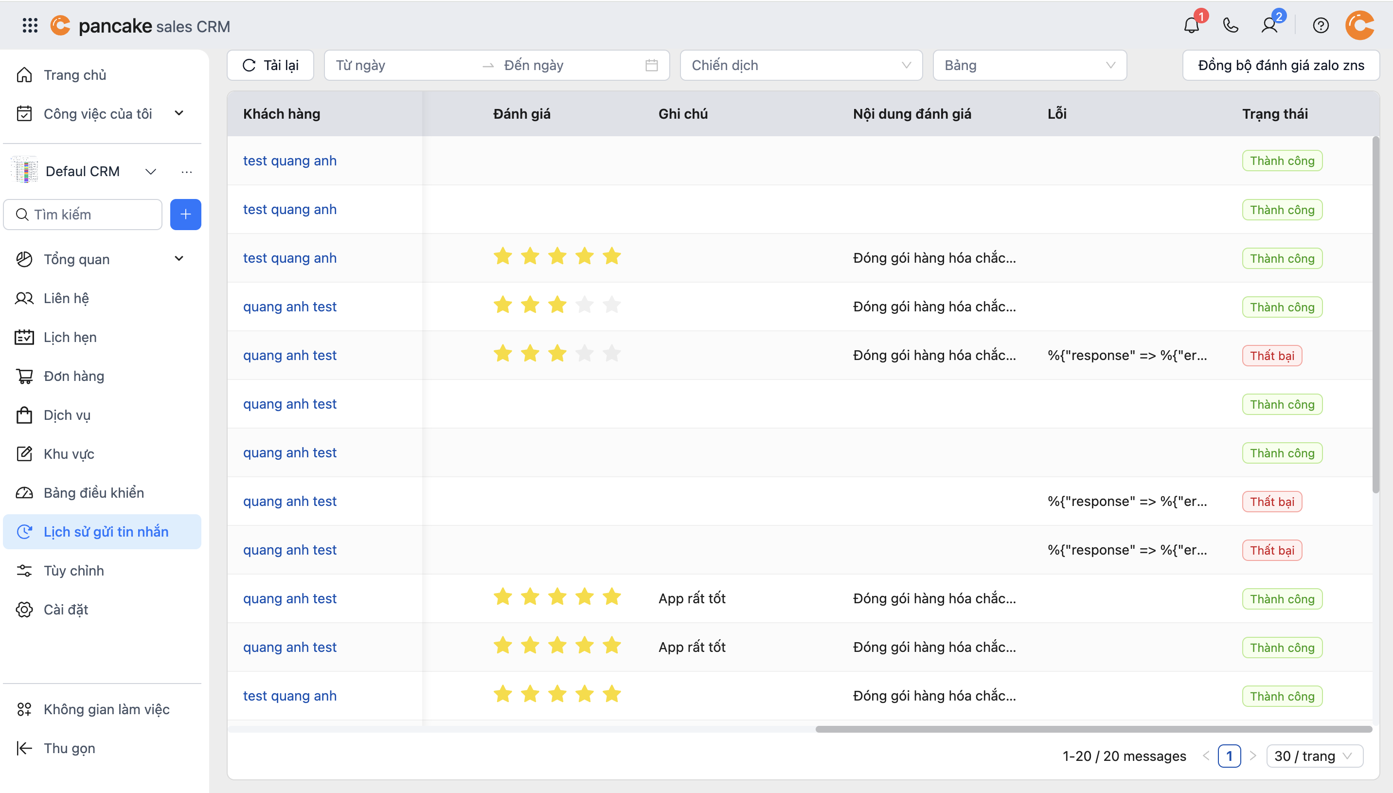 **Bước 4:** Truy cập CRM: [**crm.pancake.vn**](https://crm.pancake.vn/)**,** vào mục lịch sử gửi tin nhắn, lọc tin nhắn được gửi theo chiến dịch mà bạn tạo.