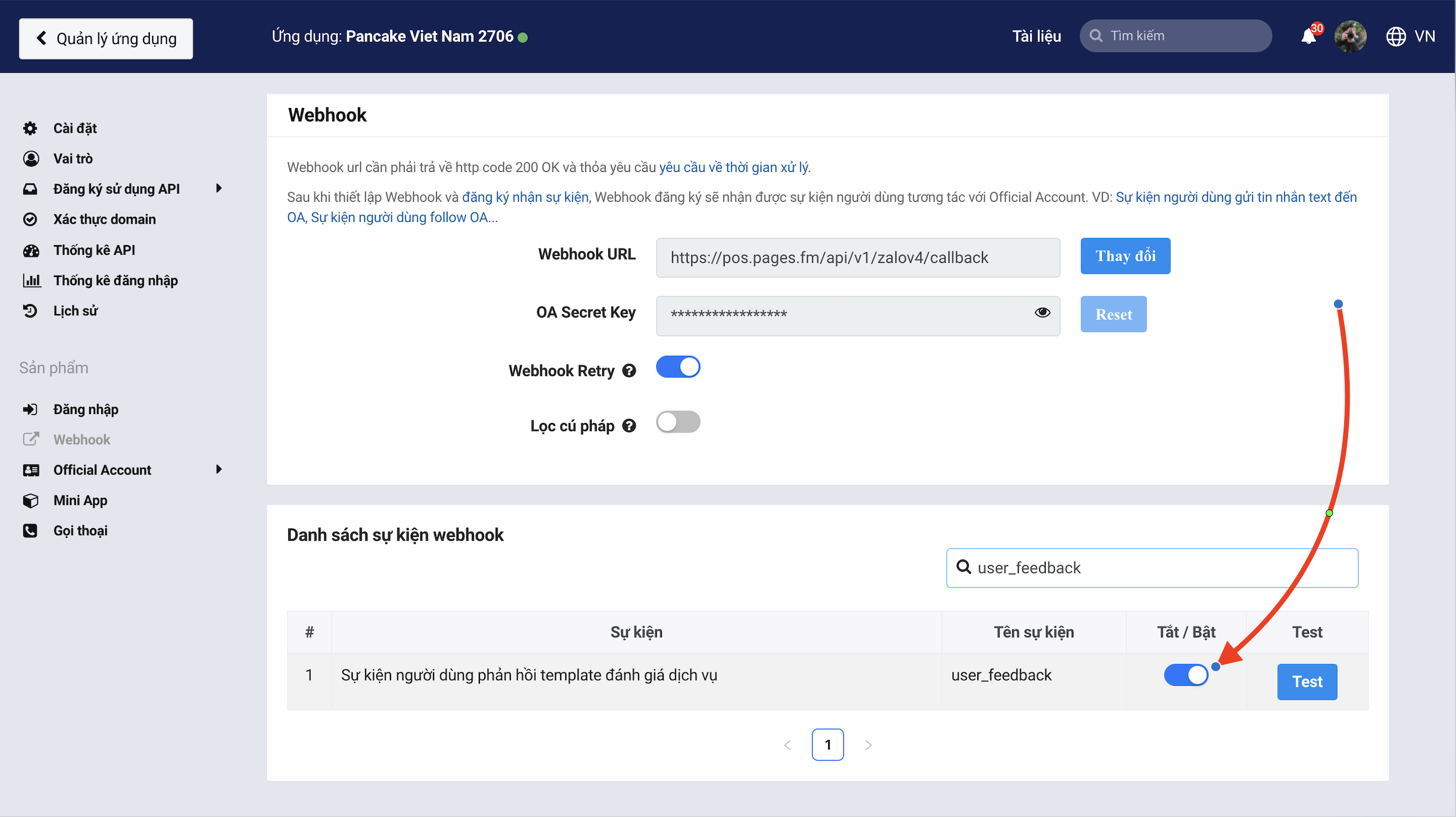 **Bước 3:** Danh sách sự kiện Webhook, bật "Sự kiện người dùng phản hồi template đánh giá dịch vụ"