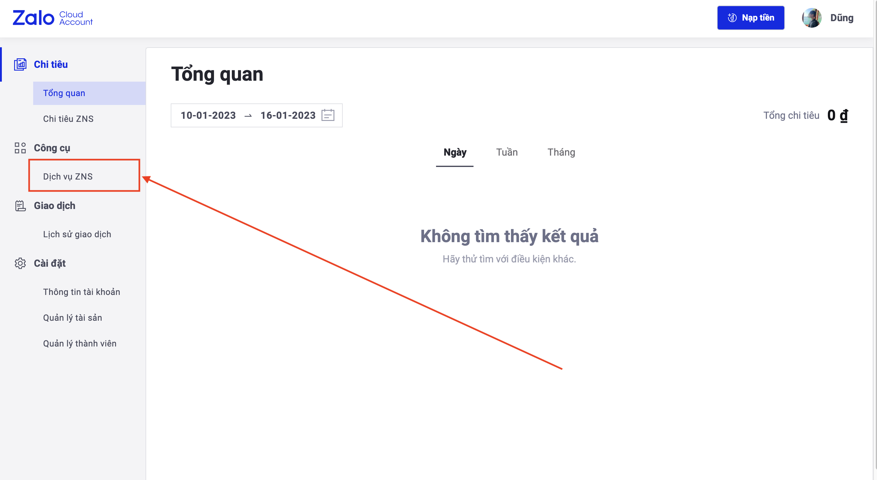 <figure><img src="https://961808962-files.gitbook.io/~/files/v0/b/gitbook-x-prod.appspot.com/o/spaces%2FXOUuQVhYSeLJNqAEHOIH%2Fuploads%2FSVX19Cz59aBMfTvPPxuh%2Fimage.png?alt=media&#x26;token=92a8d33e-d3aa-40ae-b7ce-32f5b1682016" alt="" width="563"><figcaption><p>Chọn dịch vụ ZNS</p></figcaption></figure>