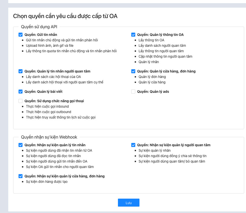 **Bước 5: Cấp quyền:** Ngay tại giao diện của Bước 4, kéo xuống dưới để "**Chọn quyền cần yêu cầu được cấp bởi OA**", Tích chọn hết như minh họa.