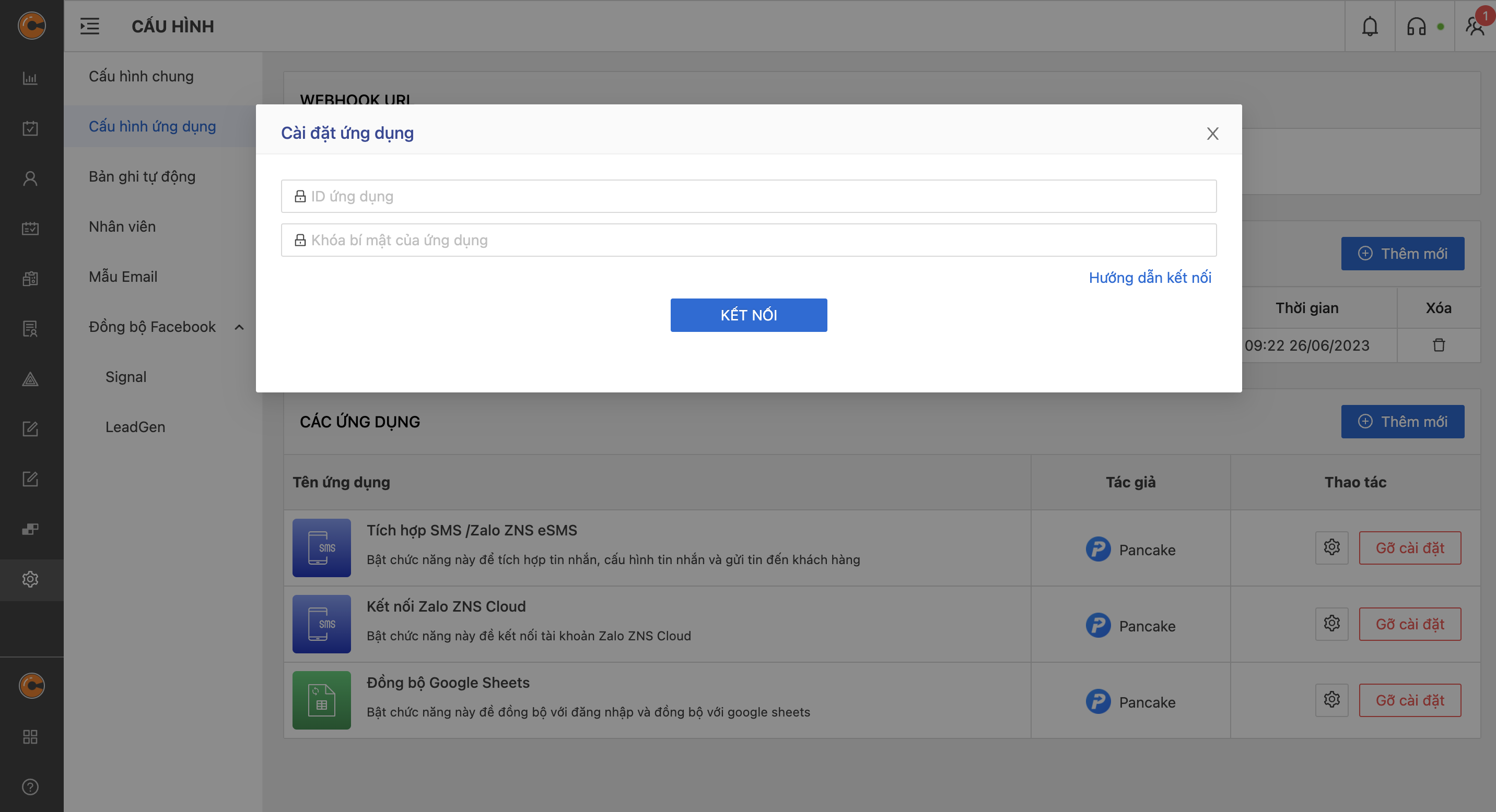 **Bước 8:** Coppy thông tin ở bước 7 vào CRM. Đầu tiên cần truy cập [**Pancake CRM** ](https://crm.pancake.vn/)(crm.pancake.vn) => Cấu hình => Cấu hình ứng dụng => Ứng dụng "Kết nối Zalo ZNS Cloud"&#x20;