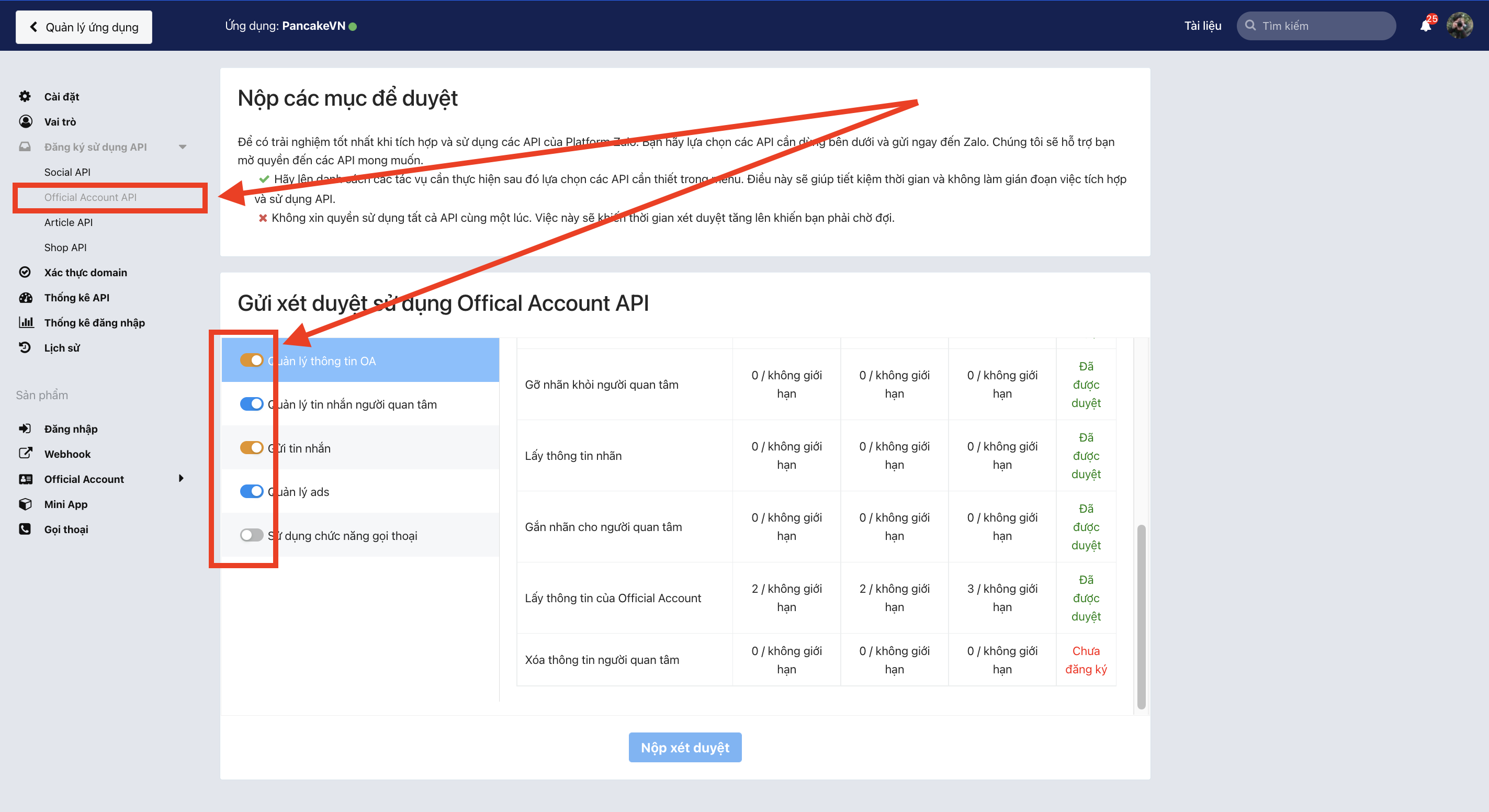 **Bước 6:** Tiếp theo, chọn đăng ký API official account => chọn mục nhỏ [**Official Account API**](https://developers.zalo.me/app/3563284482047234730/permissions?type=2), cài đặt theo nhu cầu sử dụng của bạn. Chọn xong bấm <mark style="color:orange;">**"Nộp xét duyệt"**</mark>