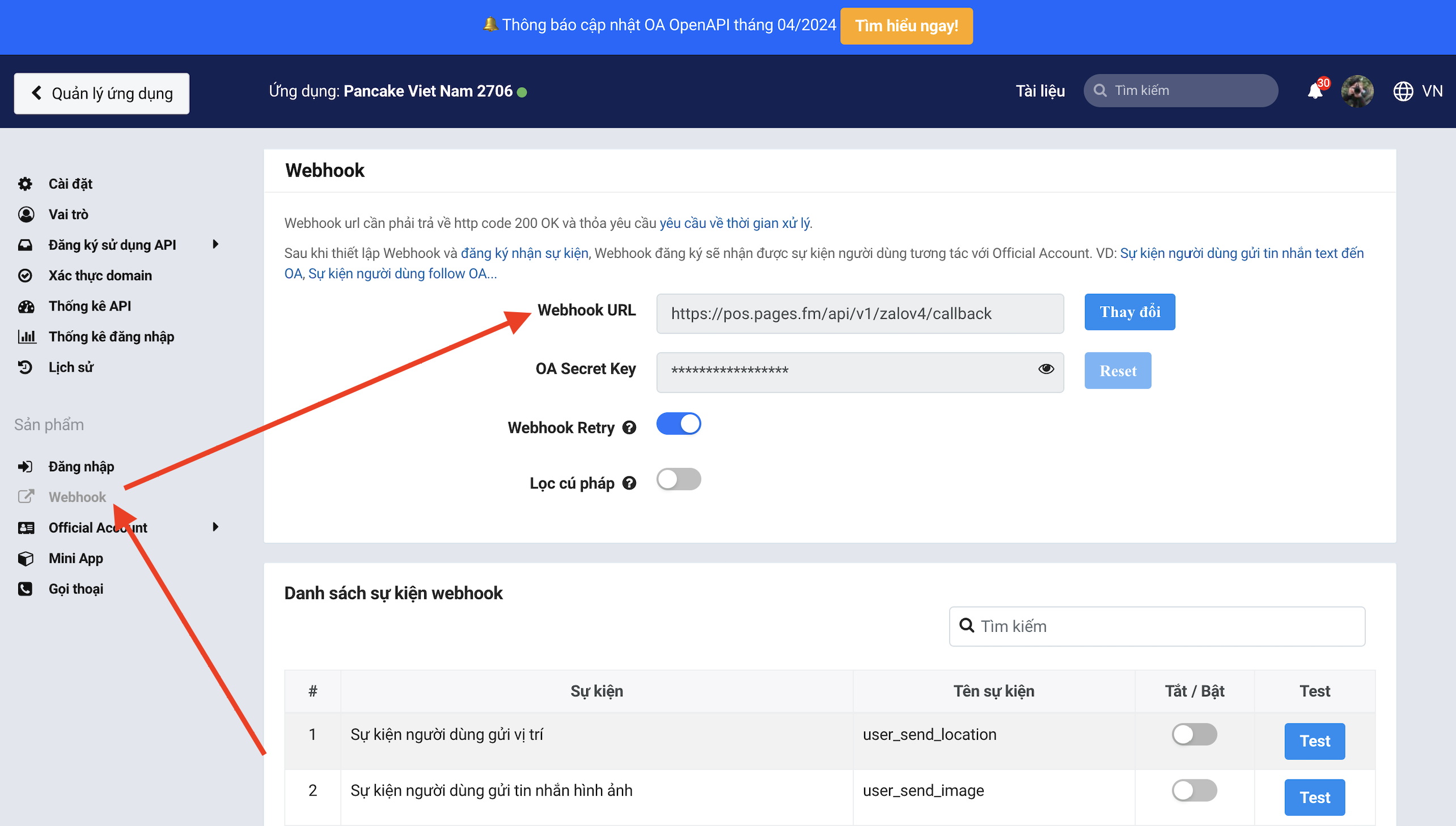 **Bước 2:** Vào mục **Webhook**, phần Webhook URL, điền nội dung sau: [**https://pos.pages.fm/api/v1/zalov4/callback**](https://pos.pages.fm/api/v1/zalov4/callback) &#x20;