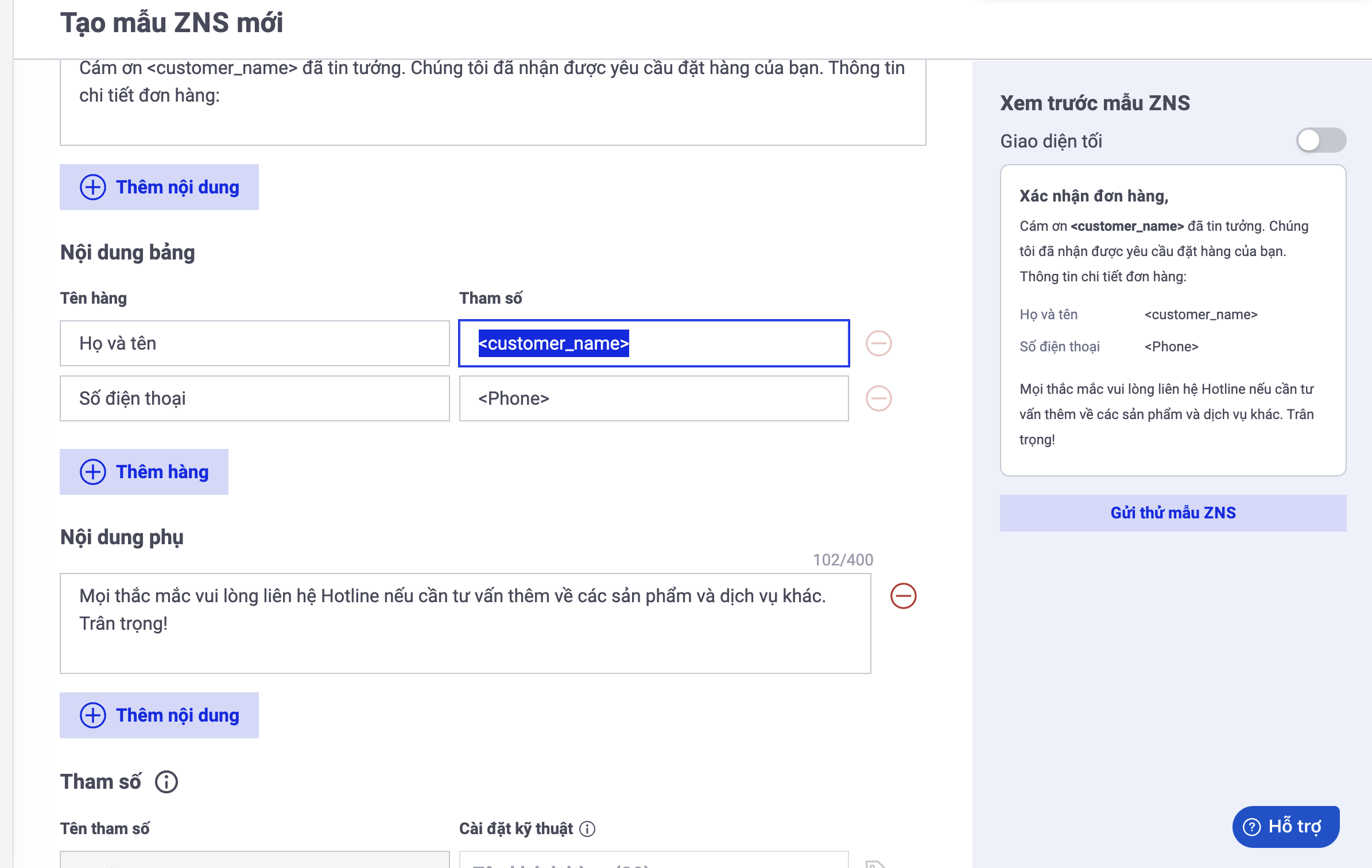 <figure><img src="https://961808962-files.gitbook.io/~/files/v0/b/gitbook-x-prod.appspot.com/o/spaces%2FXOUuQVhYSeLJNqAEHOIH%2Fuploads%2Fs18Ts6LcKjPena1mT3GB%2FA%CC%89nh%20chu%CC%A3p%20Ma%CC%80n%20hi%CC%80nh%202023-09-25%20lu%CC%81c%2015.28.42.png?alt=media&#x26;token=038f48c3-7256-4668-9c80-2252cf9be54d" alt="" width="563"><figcaption><p>Bước 2: Coppy tham số trên Mãu tin nhắn ở Zalo ZNS vào cột thêm tham số</p></figcaption></figure>