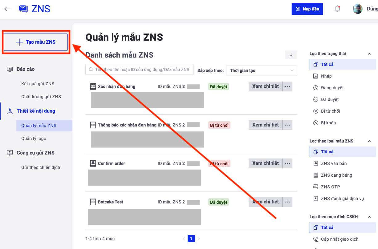 <mark style="color:orange;">**Link:**</mark> để tạo tin nhắn tại: [**https://zalo.cloud/zns**](https://zalo.cloud/zns)