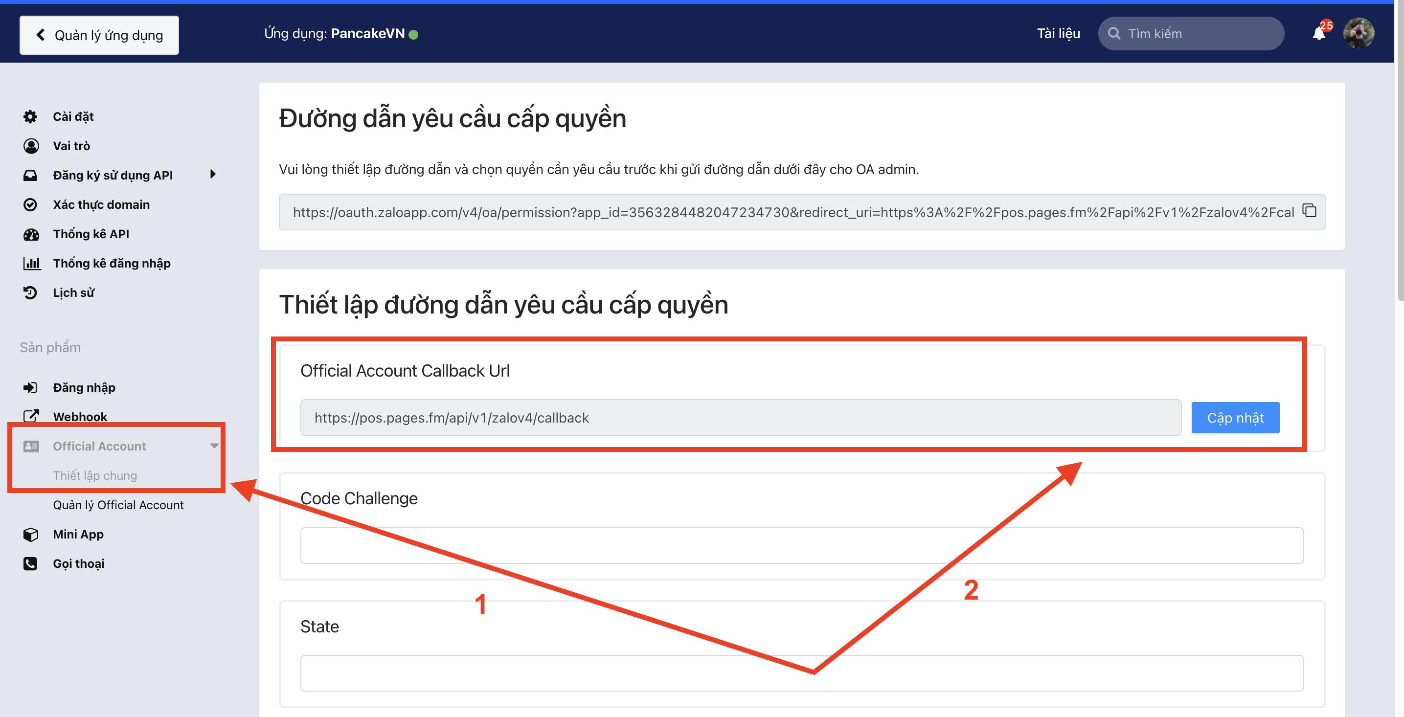 <figure><img src="https://961808962-files.gitbook.io/~/files/v0/b/gitbook-x-prod.appspot.com/o/spaces%2FXOUuQVhYSeLJNqAEHOIH%2Fuploads%2FyABpvZqc2sUjkB774ras%2Fimage.png?alt=media&#x26;token=51acf2e6-9dfb-4c50-b797-7e9f8d7e82e6" alt="" width="563"><figcaption><p>Điền call back url <mark style="color:blue;"><strong>https://pos.pages.fm/api/v1/zalov4/callback</strong></mark></p></figcaption></figure>